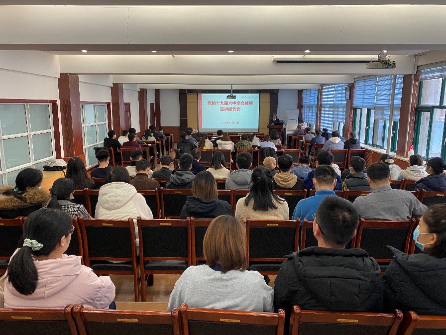 于12月14日举办了党的十九届六中全会精神宣讲报告会。学院分党委邀请学校党的十九届六中全会精神宣讲团成员、马克思主义学院副院长陈建兵教授做专题报告。学院领导班子成员、教职工党员、民主党派教师代表和学生党支部委员参加了此次报告会。李小跃书记主持了此次报告会。