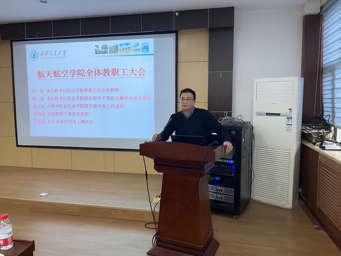 学院申胜平院长总结了学院2020年度在人才培养、科学研究、队伍建设、创新港内涵建设、学科评估、党的建设等方面的工作成绩、存在的问题与下一步工作思路。他强调,学院全体教职工要结合寒假工作会议精神思考未来工作计划,以更大的胸怀、更宽的视野和更高的格局谋划学院工作,推动力学、航空宇航学科发展,坚持问题导向、目标导向,努力破解发展瓶颈,以实干创造实绩。