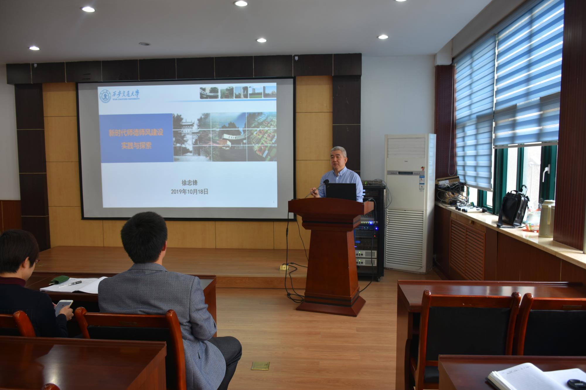 学校教务处处长徐忠锋教授为老师们做了题为《新时代师德师风建设实践与探索》的精彩报告,详细阐述了师德师风建设的内涵与外延、师德师风的承继、师德师风研究的重要性,梳理了学校层面现有的师德师风建设制度文件,对教学工作中开展宣传教育、选树先进典型、出台一流本科教育行动方案、完善大数据平台,改革综合评价与绩效考核等各项师德建设相关工作做了详细的说明。徐处长指出,对国家和民族发展来说,教育是最根本的,努力培养一流教师,提升教师队伍整体素质是教育事业发展的紧迫任务,希望广大教师能传承西安交大在教育教学工作中先进的传统文化,塑交大师德,做优秀教师。