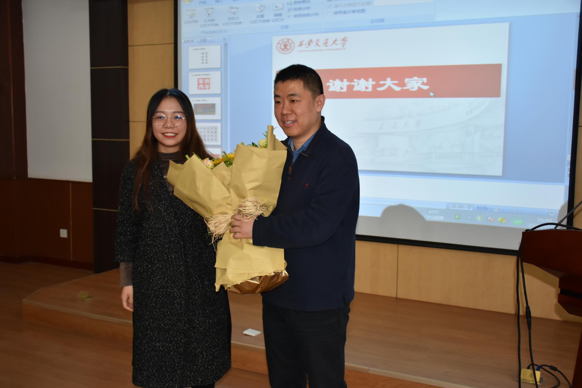 陈姣姣同学代表学院全体学生党员向张未展教授献花,表达感谢与敬意。