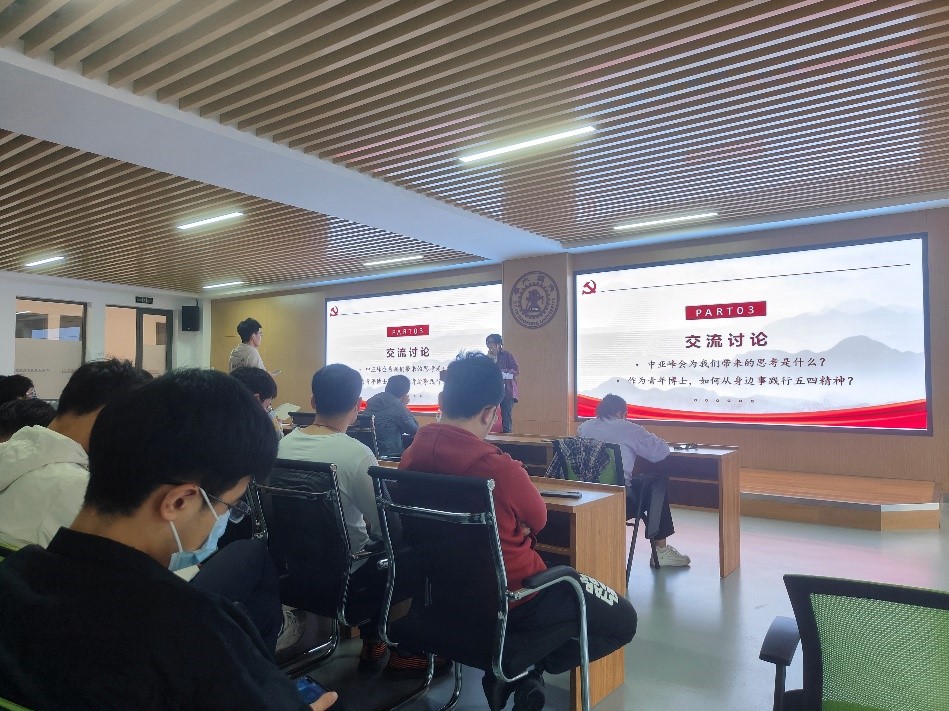 最后,卢老师对参会学生党员们提出了三个点建议,一是当代博士生党员要有较强的独立思考、判断能力,要更加关心国家大事和国际局势,培养锻炼自己的政治敏锐性;二是在谈论文化交流和科学交流时,最好的方式就是切身地实践。正所谓“读万卷书,行万里路”,学校和学院提供了良好的对外交流平台,同学们更应当把握住机会;三是博士党员更应该拿出积极向上的人生态度,在科学自信和文化自信上起到先锋模范作用。中亚峰会的成功召开彰显了中国国力的提升,而中国国力的提升正是因为一代代青年人不断地践行五四精神,当代博士更应继承弘扬和发展五四精神,为科技自力自强奉献自己的力量。