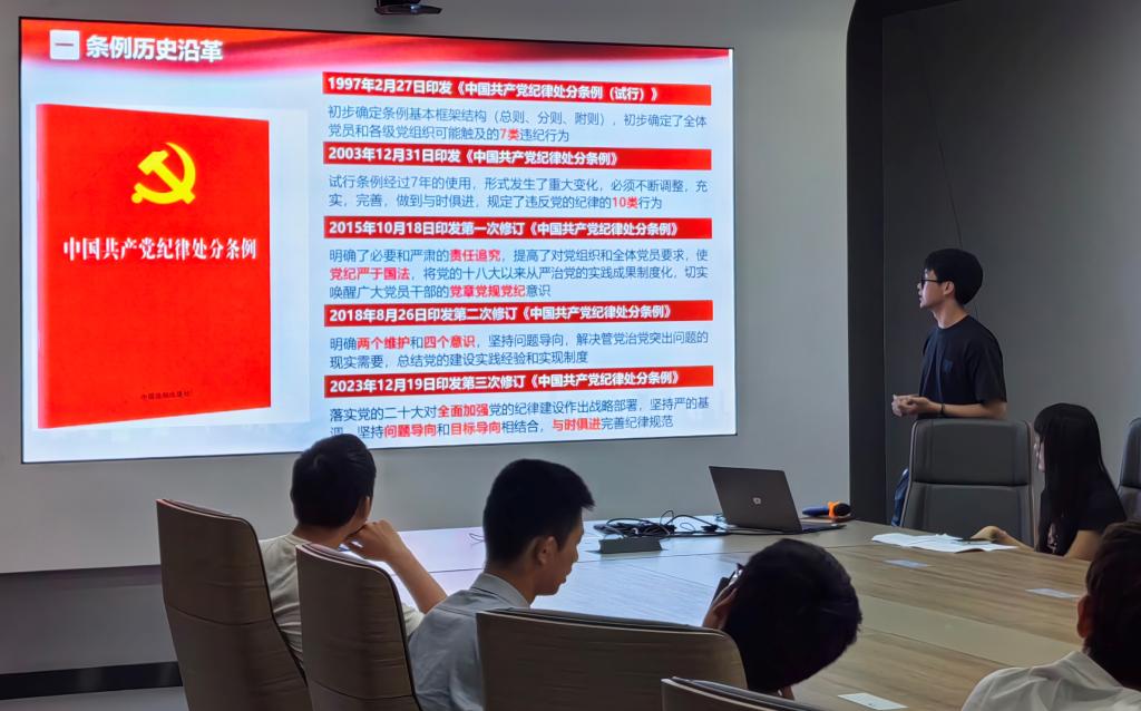 接下来,支部书记林俊杰进行《知底线,守红线》专题领学,并同与会党员、积极分子分享近期学习成果。他首先介绍《中国共产党纪律处分条例》的历史沿革,历次修订完善了条例的适用范围,明确了必要和严肃的责任追究,提高了对党组织和全体党员的要求,坚持问题导向和目标导向相结合,与时俱进地完善纪律规范。