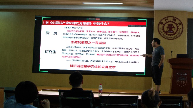 最后,卢同庆总结讲话。他高度评价了此次活动的成效,指出条例学习对党员纪律意识的提升具有重要意义,并要求研究生党员要将学到的知识融入实际科研工作中,严格遵守党的纪律,坚守岗位职责,同时,他鼓励大家树立自信心,保持良好作风,积极发挥先锋模范作用,为各支部的健康发展和学院的长远建设贡献力量。