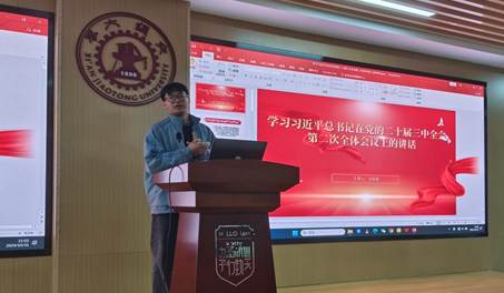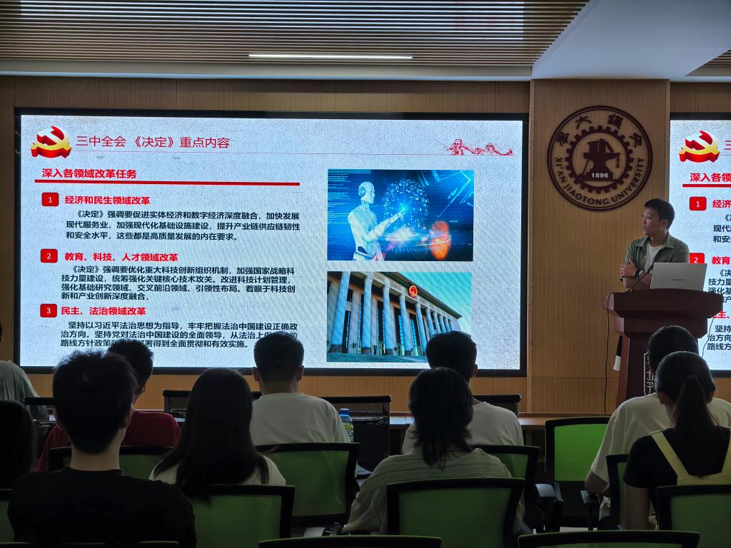 2023级硕士生第二党支部在2-4197会议室开展关于党的二十届三中全会专题学习研讨。支部成员王骁凯、王昭旺、文佳豪分别就党的二十届三中全会主要成果、新时代党的内部团结、理解领悟习近平总书记在党的二十届三中全会第二次全体会议上的讲话进行主题分享。本次专题研讨由支部书记林俊杰主持,支部全体成员参加。