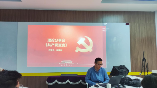 本次理论学习的书目为《共产党宣言》。在《共产党宣言》第一章中,马克思有如下论述:“工人有时也得到胜利,但这种胜利只是暂时的。他们斗争的真正成果并不是直接取得的成功,而是工人的越来越扩大的联合。”理论小组成员们结合《共产党宣言》、社会主义阵营在冷战的战败和中国特色社会主义的成功等方面,对马克思以上论述阐述了自己的心得与体会。