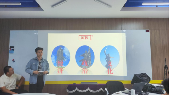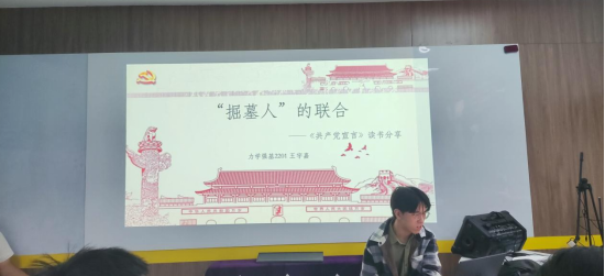 周楚峰同学从“联合”二字破题,在分享之初便发出了那句振聋发聩的话:“全世界无产者联合起来!”人心齐,泰山移,人多力量大。他认为,以罢工为主要形式的经济斗争无法带来永久性的工人生存状况的改善,因而胜利只是暂时的,是不能直接取得成功的。但是“一位工人罢工,饿死的是那位工人;工人阶级罢工,饿死的是资产阶级!”这便是为什么要主张越来越扩大的联合。他的观点与刘恪维同学的观点不谋而合。为了论证自己的观点,周楚峰同学从政治、经济、文化,三个方面剖析了苏联解体的原因,通过分享“几人参加晚宴,讨论国家大事”的现象,让大家切实体会到“联合”的重要意义。