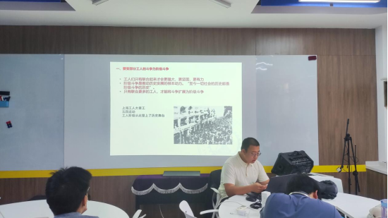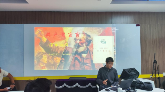 王宇嘉同学别出心裁地采用了马克思主义基本原理的辩证唯物主义来解释《共产党宣言》,他大胆地将封建社会的资产阶级与资本主义社会的无产阶级做类比,从唯物史观的角度,阐释了工人阶级应当像资产阶级发展那般通过扩大联合来进行反抗斗争。王同学又将“暂时的胜利”进一步延伸为“工人阶级的多数对于少数的胜利”,将“扩大联合”进一步延伸为“工人阶级内部先进势力的扩大”,与参会成员们一起探讨了工会中“伪联合”的搭便车现象,并通过国内外公会工作形式的区别进行了反思与思考,一起讨论了如今的中国工会依旧可以改善的地方。