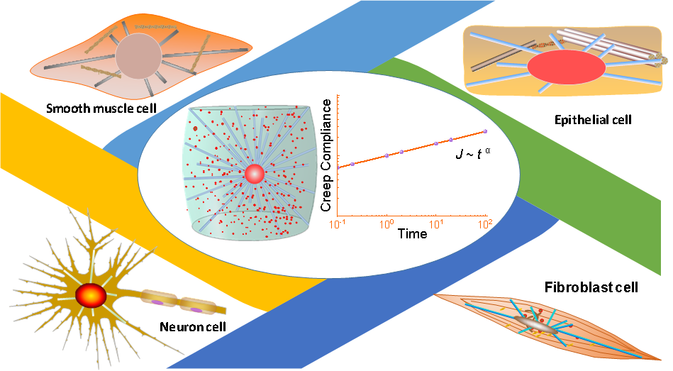 力学在生物体发育过程中扮演着重要角色,随着细胞生物学的快速发展,力学因素在细胞尺度上的调控作用受到越来越多的关注。在不同类型、不同状态的活细胞粘弹性响应中(图1),存在着一个统一的标度律响应。尽管已有非常多的模型用于探究细胞的流变学行为,然而,细胞标度律响应是如何自发产生的?力学在其中扮演什么样的角色?标度律指数中又蕴含着什么样的物理规律?这些问题至今尚不清楚。