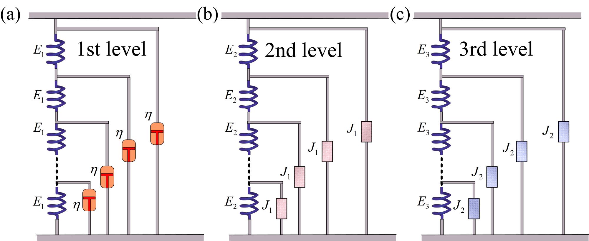 徐光魁教授团队通过考虑细胞诸多组分的细胞结构建立了揭示活细胞标度律流变学响应机制的自相似多级结构模型(图2),并受结构模型启发,建立了自相似的多级结构理论模型(图3),揭示了标度律流变学的形成机制,发现了细胞刚度在标度律指数变化中的调控作用,给出了标度律指数与细胞刚度的统一关系以及相应的物理规律。不仅可以自发地再现蠕变柔量随时间或复模量随频率变化的标度律响应规律,还实现了标度律指数与细胞刚度的普适关系。模型预测结果与不同类型的细胞、不同状态的细胞实验数据都相吻合。该研究表明,细胞材料普适的标度律响应主要取决于其统一的结构特征,而不是具体的分子特性。该项研究不仅可以为生物组织材料的仿生设计和应用提供理论基础,还可以为医学诊断、药物开发以及预后评估提供新的思路和理论指导。