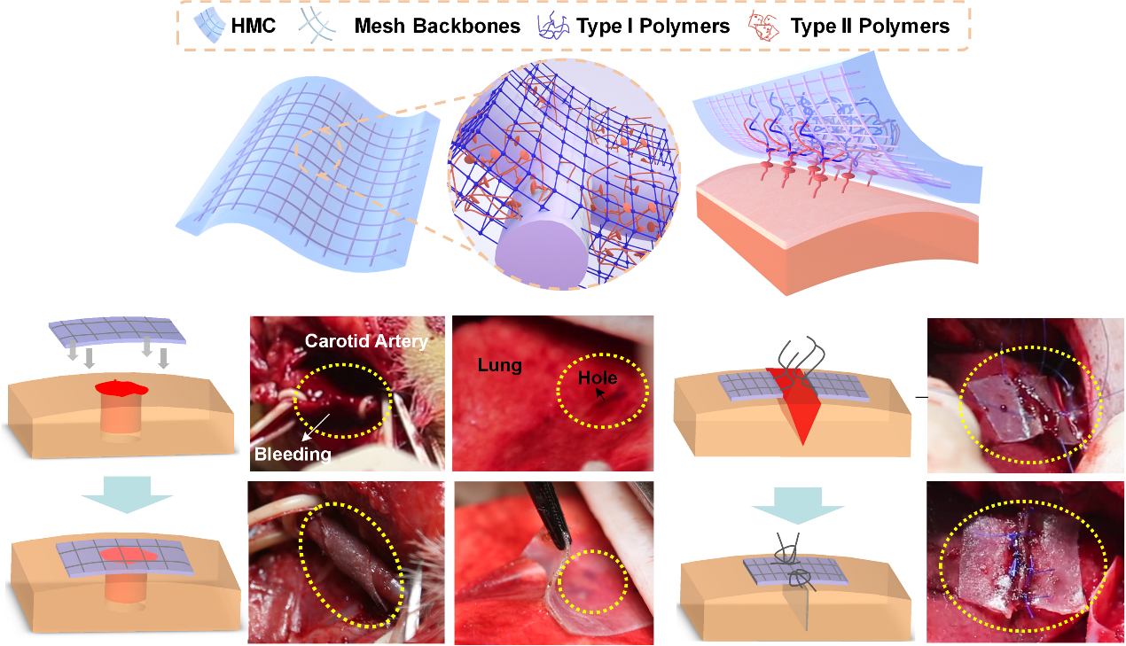 针对这一问题,91porn 机械结构强度与振动国家重点实验室、91porn 软机器实验室研究人员卢同庆教授及高扬副教授与哈佛大学锁志刚院士提出了一种水凝胶复合补片医用新材料(Hydrogel-mesh composite, HMC)。通过将抗溶胀组织黏附水凝胶与外科补片以宏观拓扑互穿结构进行复合,得到的水凝胶复合补片在与组织形成强粘接的同时,还综合了水凝胶及外科补片的优点,如生物相容性、对水及小分子的可渗透性,高的面内刚度及低的弯曲刚度等。这种水凝胶复合补片在组织修复、密封、止血和无缝线创口闭合方面,特别是在承受高应力组织之上的应用中表现出巨大潜力。