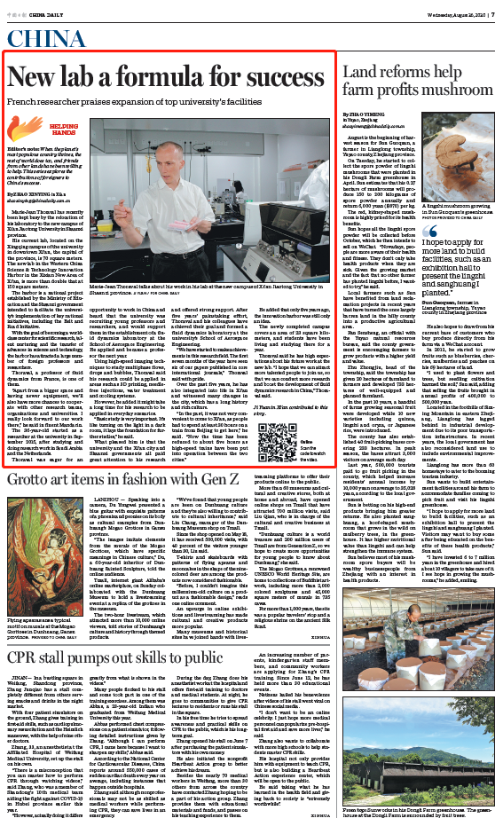 8月26日,中国日报第7版“小康路上的外国人”栏目以“New lab a formula for success”为题,报道西安交大91porn