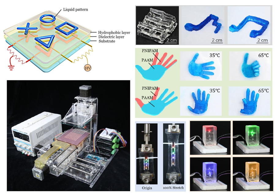 91porn 机械结构强度与振动国家重点实验室建立了软机器实验室。近日,实验室研究人员提出了利用电容器边缘效应来大规模制备液体图案的新方法,通过将电场控制液体图形化与逐层叠加过程相结合,建立了水凝胶三维打印系统。该技术适用于各种物化性质水凝胶,无需额外混入添加组分,克服了现有技术的局限性。实现了水凝胶支架、温度敏感的水凝胶复合材料和高完整性离子水凝胶显示装置等的3D打印。该技术为使用多种材料成分和复杂几何结构的水凝胶快速成型提供了新手段。