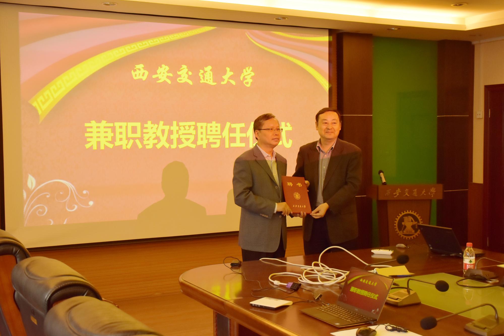 兼职教授,王铁军副校长向谭永华教授颁发聘书并为其佩戴校徽。航天科技集团六院研发部论证中心王拴虎主任、科技委办公室李晨副主任,西安交大科研院苏光辉副院长、91porn