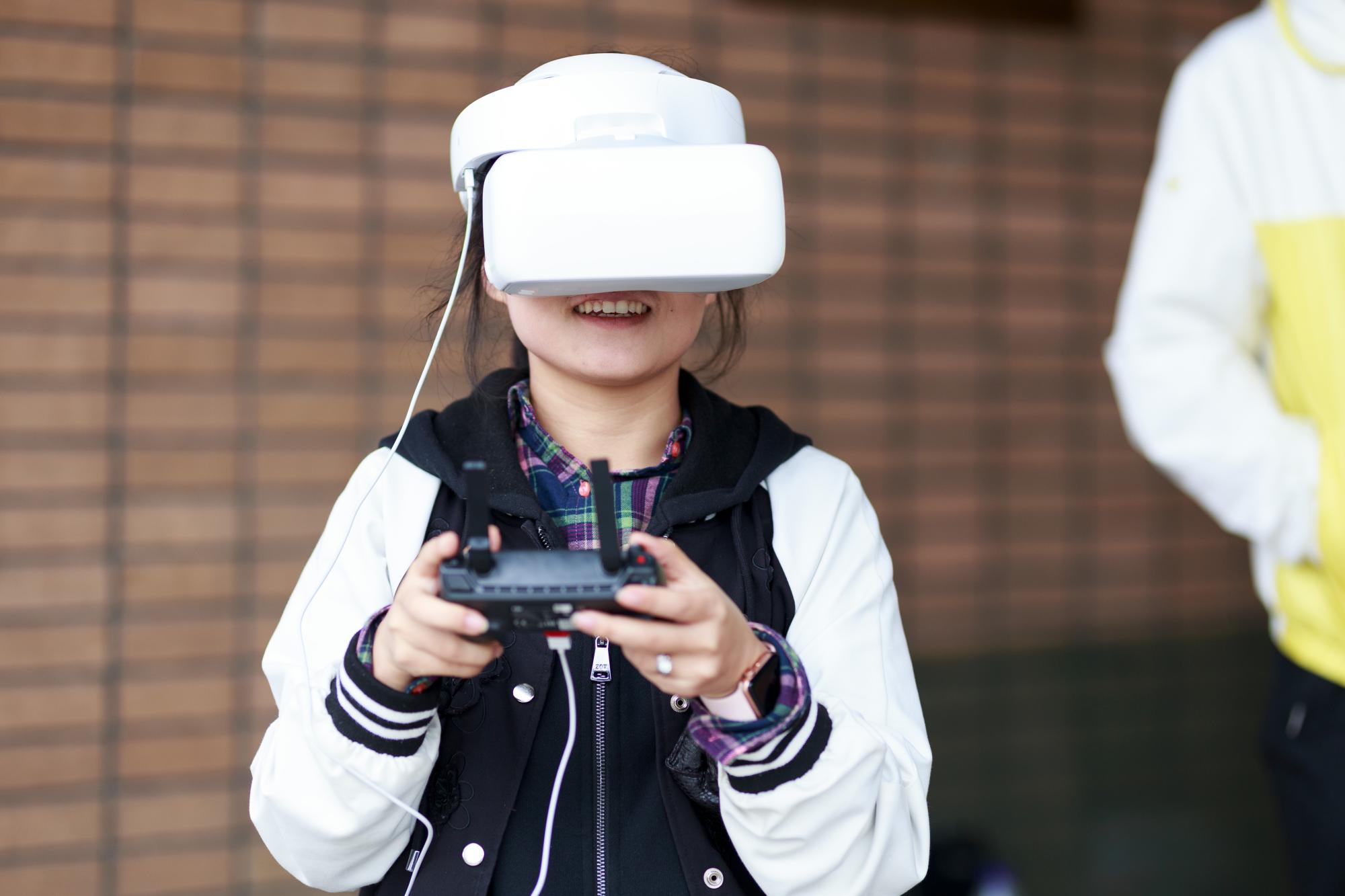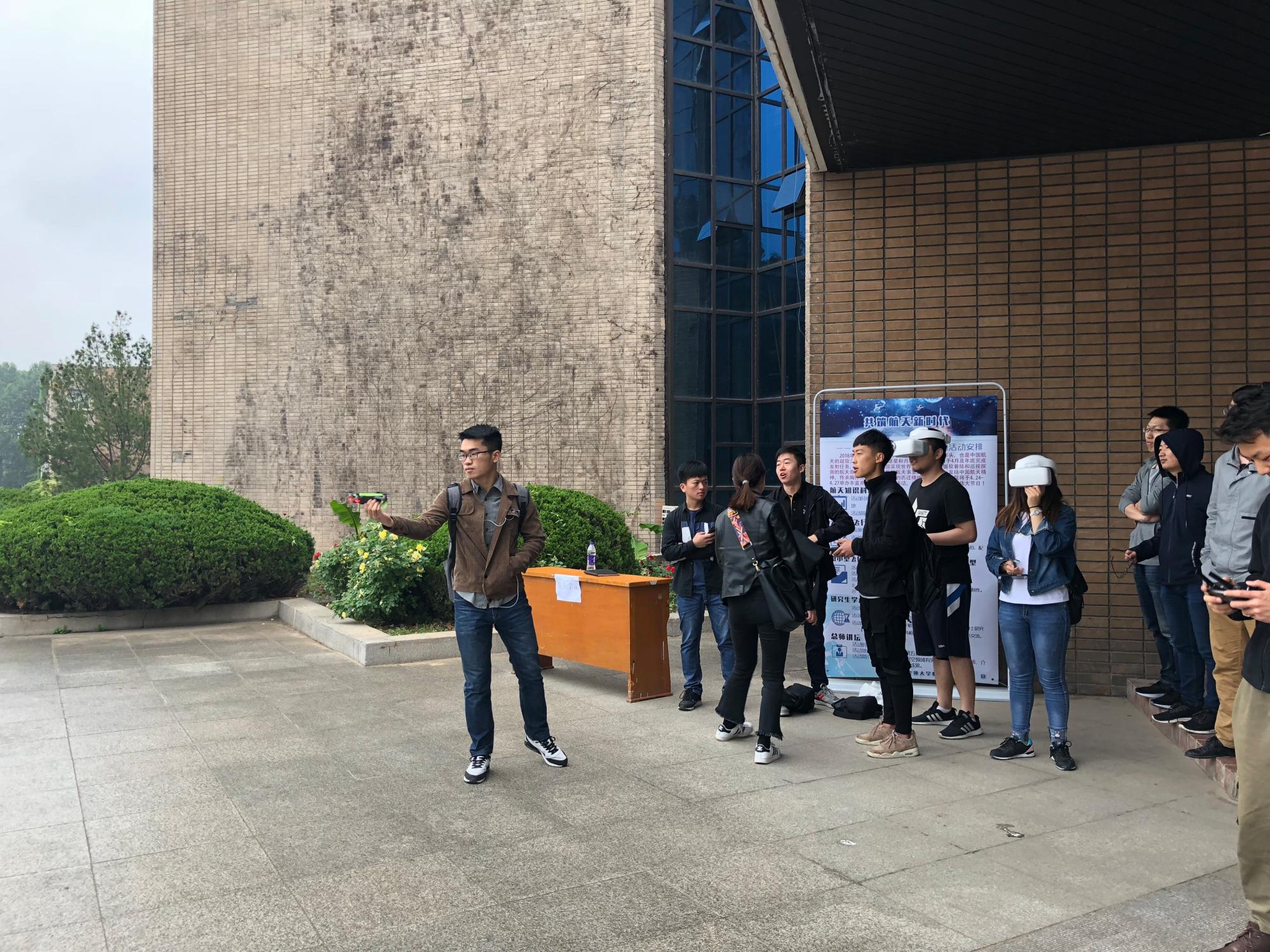 外场活动无人机第一视角飞行VR体验,通过在无人机加装无线图像传输设备,参与人员可以在地面通过视频眼镜或显示屏看到无人机飞行时的前方画面,据此操控无人机前进。前往体验第一视角飞行的师生络绎不绝。硕7073赵娜表示,很少参加活动但通过亲手操作和VR体验,领略不同高度视野,开拓了视野增长知识,增加了我对飞行器了解的热情。