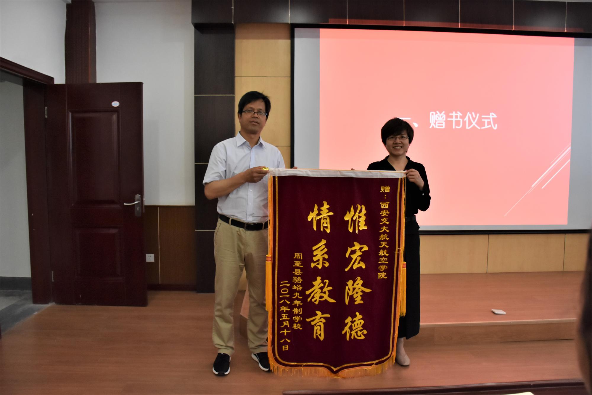 骆峪九年制学校副校长王肖军老师为感谢学校学院对山区学生的关怀,送来了锦旗。吴莹副院长接过锦旗并充分肯定本次活动的意义,希望参加此次活动的中学生们有所收获,希望更多的同学走进交大,为国效力。