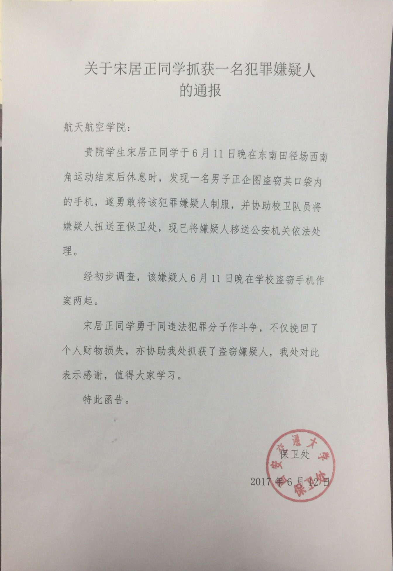 6月12日上午,保卫处领导将宋居正同学的表彰通报送至学院学工办公室,据了解在6月11日晚,我院博1712班宋居正同学在东南田径场西南角运动休息时,发现一名男子企图盗窃其口袋内的手机,遂勇敢将该犯罪嫌疑人制服,并协助校卫队员将嫌疑人扭送至保卫处,现嫌疑人已受到公安机关依法处置。