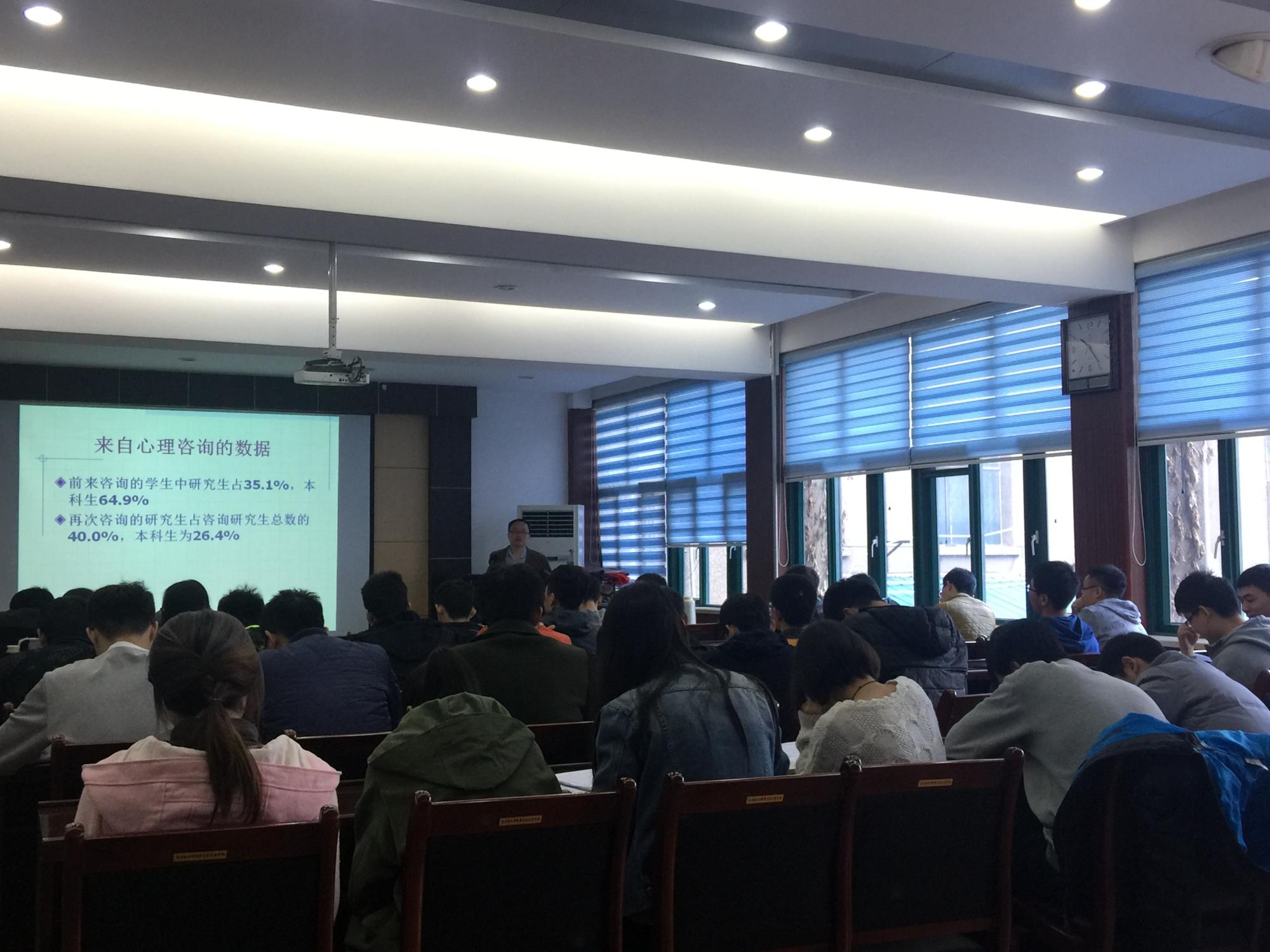 心理健康知识讲座“研究生心理健康与自我调节”在第五会议室举办,本次讲座由校心理健康教育与咨询中心的姚斌副教授主讲,学院2016级全体研究生参加本次讲座,会议由研究生辅导员李昱静老师主持,本次讲座为我校研究生心理健康活动月的系列活动之一,对全体新生的研究生生活的自我调节和适应具有一定指导意义。