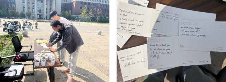 活动期间,许多同学纷纷拿出自己闲置的书籍,前往力行楼西门进行无偿捐献,并写下了勉励贺卡,希望孩子们能够认真学习,把握美好时光,通过书本知识学到真理,为我国的社会主义现代化建设添砖加瓦。