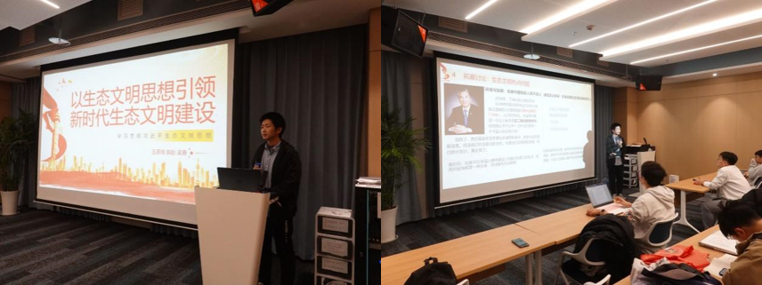 王思琦同学进行党的二十大精神专题领学,他结合习近平总书记从梁家河到上海工作期间对于生态文明建设的各项举措,详细讲述了习近平生态文明思想的形成过程、科学内涵和理论贡献,并深入探讨新时代深入贯彻习近平生态文明思想的深刻意义,倡议同学们胸怀国之大者,坚持思想引领、系统观念、内外联动,践行绿色发展理念。