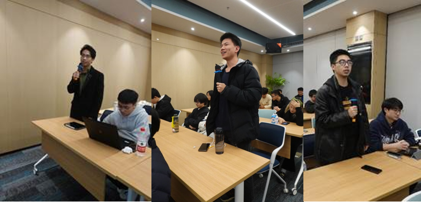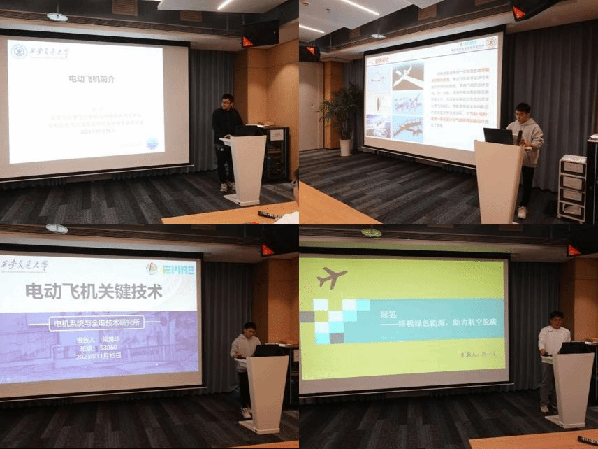 2023级硕士生第二党支部张洋同学结合所学专业从定义、分类、发展历史和创新技术四个方面介绍了电动飞机;S3060党支部梁博华同学分享了电动飞机的总体设计技术、高效高功重比电推进技术、能量综合管理技术、能源系统技术等关键技术;S3073党支部冯一工同学进行了 “绿氢——终极绿色能源,助力航空脱碳”的主题分享,介绍了清洁能源“绿氢”的产生与优势。