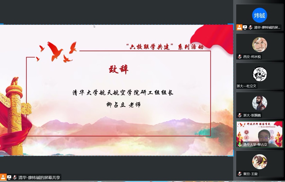 研工组组长柳占立致辞。他指出,六校党支部共建,能够加强党支部之间、高校之间、以及学科之间的相互交流,拓展了党支部建设的形式。本次活动主题是“科技兴邦,强国有我”,恰逢2022年最后一天,希望通过各支部对年度支部建设经验总结分享、交流学习,促进预祝本次活动成功举办。