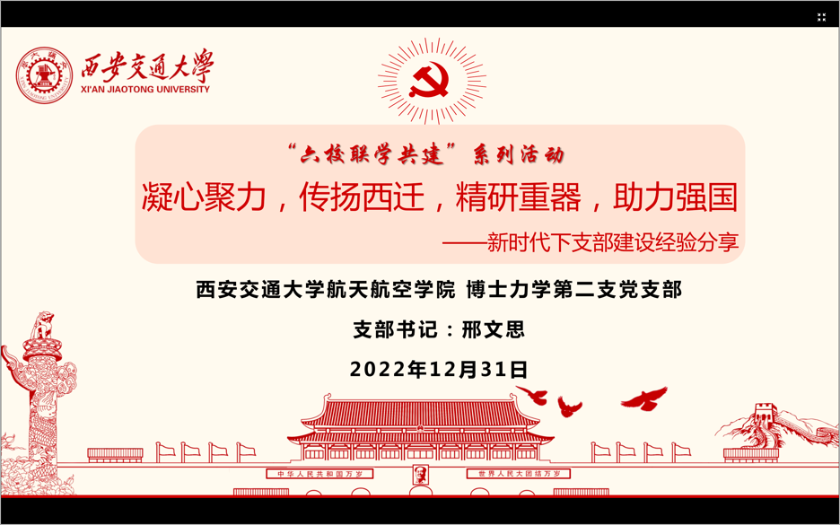 为回顾党的十八大以来,我国在科技创新领域取得的伟大成就,学习在力学、航空航天、能源、材料等工学学科重大科研领域中的杰出贡献者的精神事迹,2022年12月31日下午,北京大学工学院力学19博党支部联合清华大学91porn