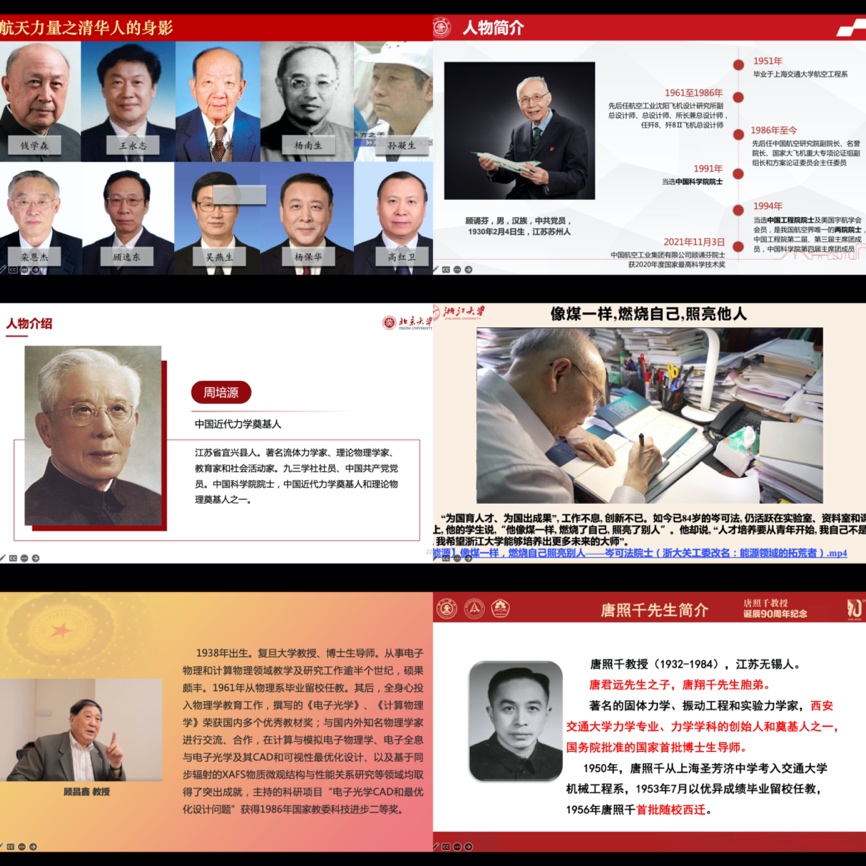 学生微宣讲团毛新宇围绕六校大师学者的精神事迹开展领学。他首先介绍了我国航天发展中的清华身影,包括以钱学森为代表、曾获“两弹一星”功勋奖章的14位清华校友。第二位是从“立志报国”“忘我钻研”“勤奋刻苦”三个方面介绍了2020年度国家最高科学技术奖获得者顾诵芬的精神事迹。第三位大师是中国科学院院士、中国近代力学的奠基人周培源,毛新宇分别从“胸怀祖国,勇攀高峰”“托举后背,为国育才”“胸怀天下,铁肩道义”“尽心国是,建家交友”四个方面介绍了周培源光辉的精神事迹。第四位介绍了“像煤一样,燃烧自己,照亮他人”的浙江大学能源工程学院岑可法院士。岑可法院士情系教育、甘为人梯、诲人不倦,功勋卓著又两袖清风,是每一位浙大人学习的榜样。第五位介绍了复旦大学教授顾昌鑫及其在激光大气通讯领域取得重大突破和巨大贡献。最后,第六位介绍了我国著名的固体力学、振动工程和实验力学家,91porn