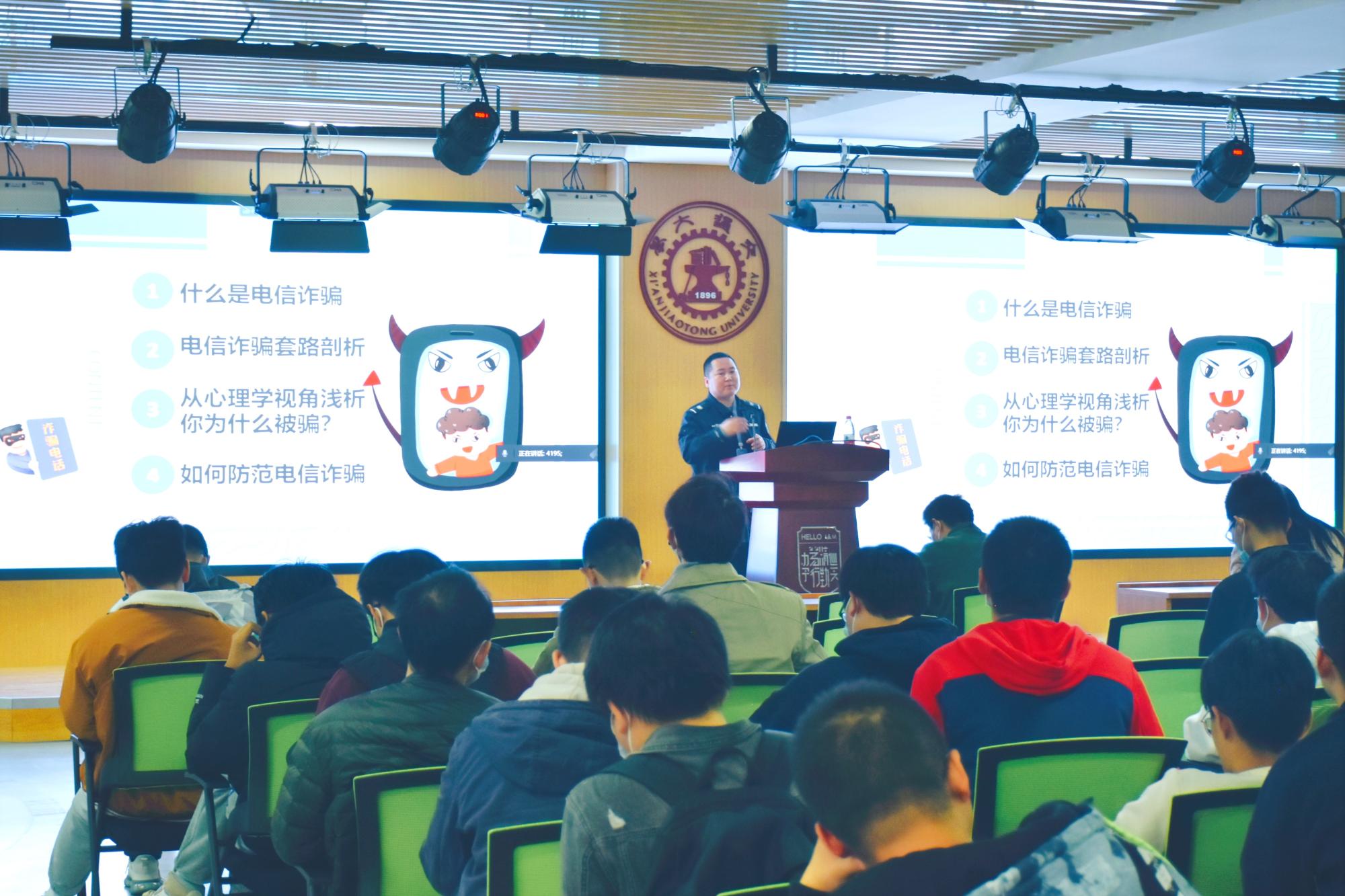 常老师以询问是否有在场同学经历过电信诈骗为切入点,激起了同学们的热情反馈。接着,常老师从什么是电信诈骗、当前电信诈骗的套路、心理学角度以及如何防范诈骗四个方面对电信诈骗作了细致的剖析。然后分别从消防安全和交通安全两方面强调了经常遇到的安全问题及对应措施。常老师通过校园安全案件实例进行讲解,幽默风趣,同学们热情高涨,反响热烈。
