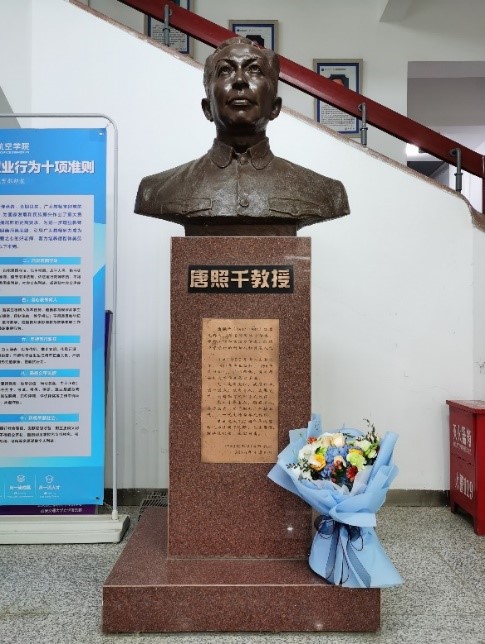 青年师生能继承发扬西迁精神,在新时代为祖国的繁荣富强贡献青春力量。访谈结束后,胡奈赛教授将鲜花献于唐照千先生雕像前,向以朱城、唐照千等为代表的西迁前辈致敬。