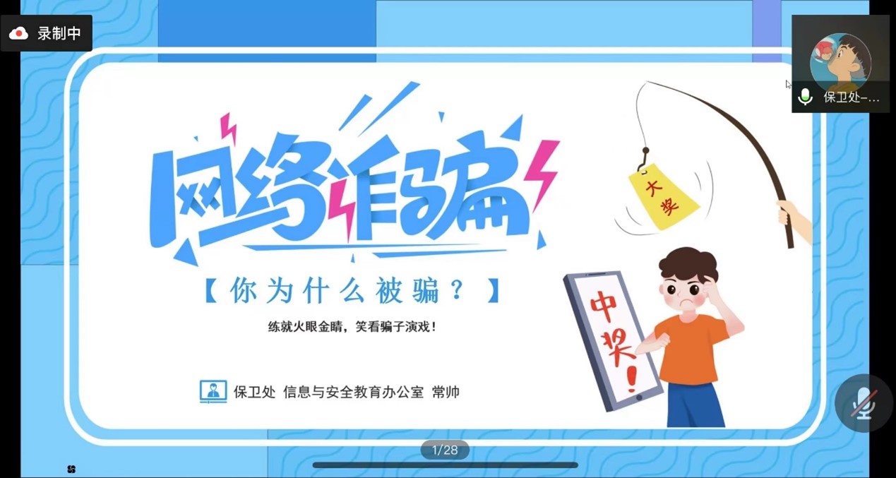 邀请校保卫处常帅为航天学子带来《你为什么被骗》防诈骗主题讲座。举办反诈宣传讲座。讲座由团工委书记李昱静老师主持,300余名研究生线上参加。