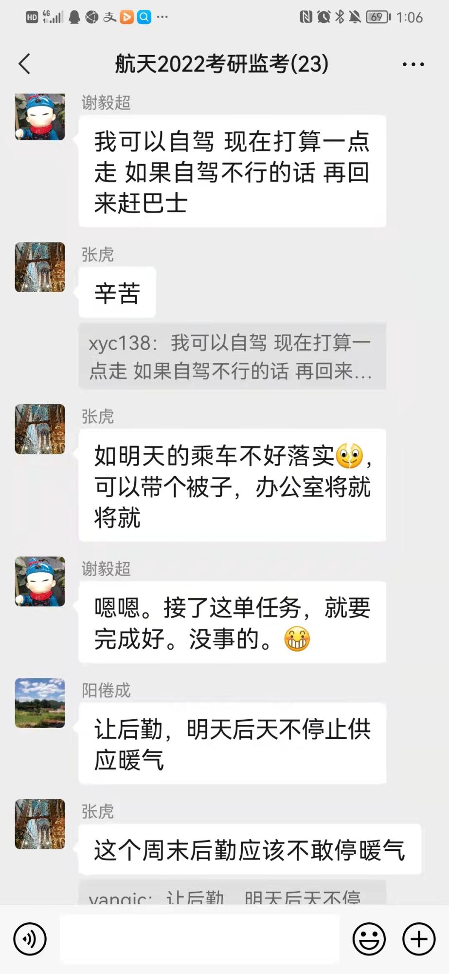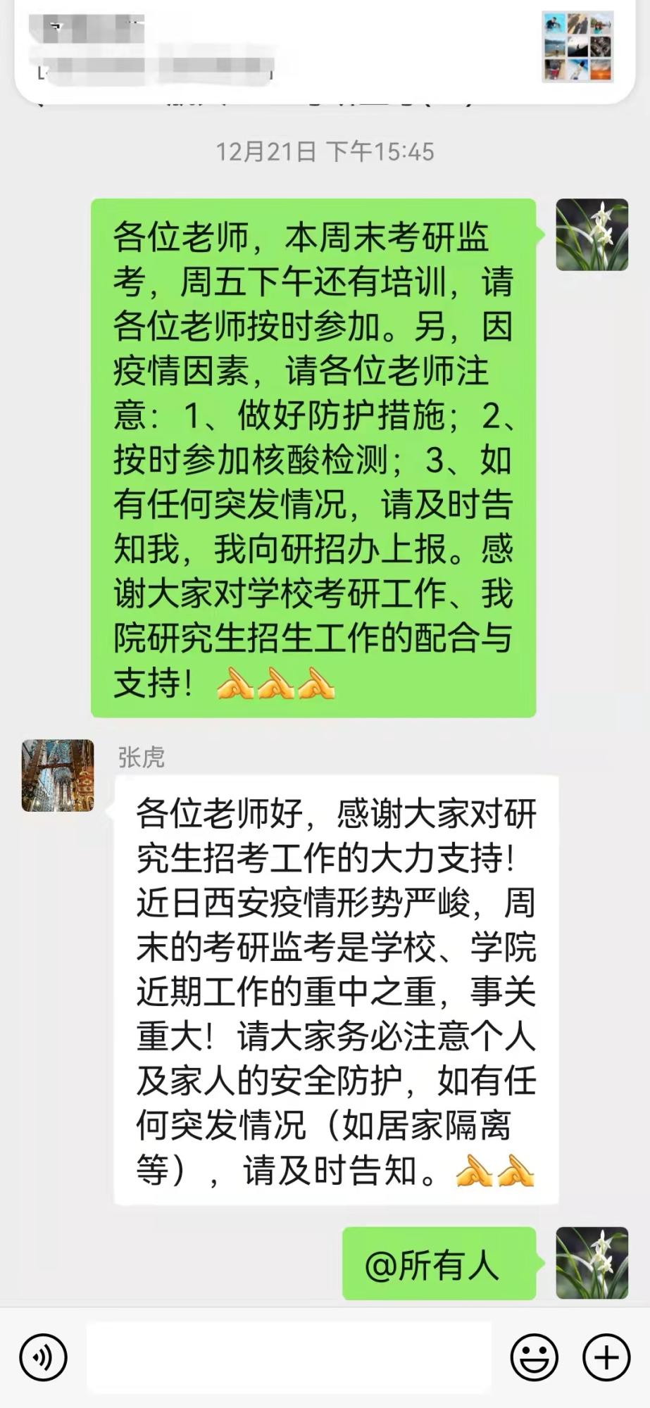 根据研究生院安排,我院选派了20名经验丰富、认真负责的教职工担任2022年硕士研究生入学考试监考工作。从12月中旬开始,西安疫情进入严峻态势,考研前2周,一方面通过网页、qq群、微信群等途径通知考生填写情况摸排,了解考生动态信息,另一方面,每日动态统计监考老师身体状况,提醒防疫要求,制定协调预案,一旦出现突发情况立即上报并启动补救措施。考研前,院长助理张虎代表学院向各位监考老师对学院研究生招生工作的大力支持表示感谢,强调做好疫情防控和坚守监考职责的重要性,并积极协调各方解决监考老师的实际困难。家住创新港的谢毅超老师表示,虽然目前疫情严重,但既然接了监考任务,无论如何都要克服困难把它完成好!