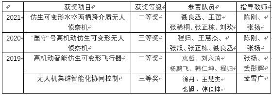 智能飞行器设计与控制研究团队自2019年开始参加第五届中国研究生未来飞行器创新大赛。目前在智能变形仿生飞行器、飞行器人工智能控制技术等前沿技术领域作品,获得两项全国二等奖、两项全国三等奖。此外还获得2020年度全国空天杯全国飞行器创新大赛二等奖一项。