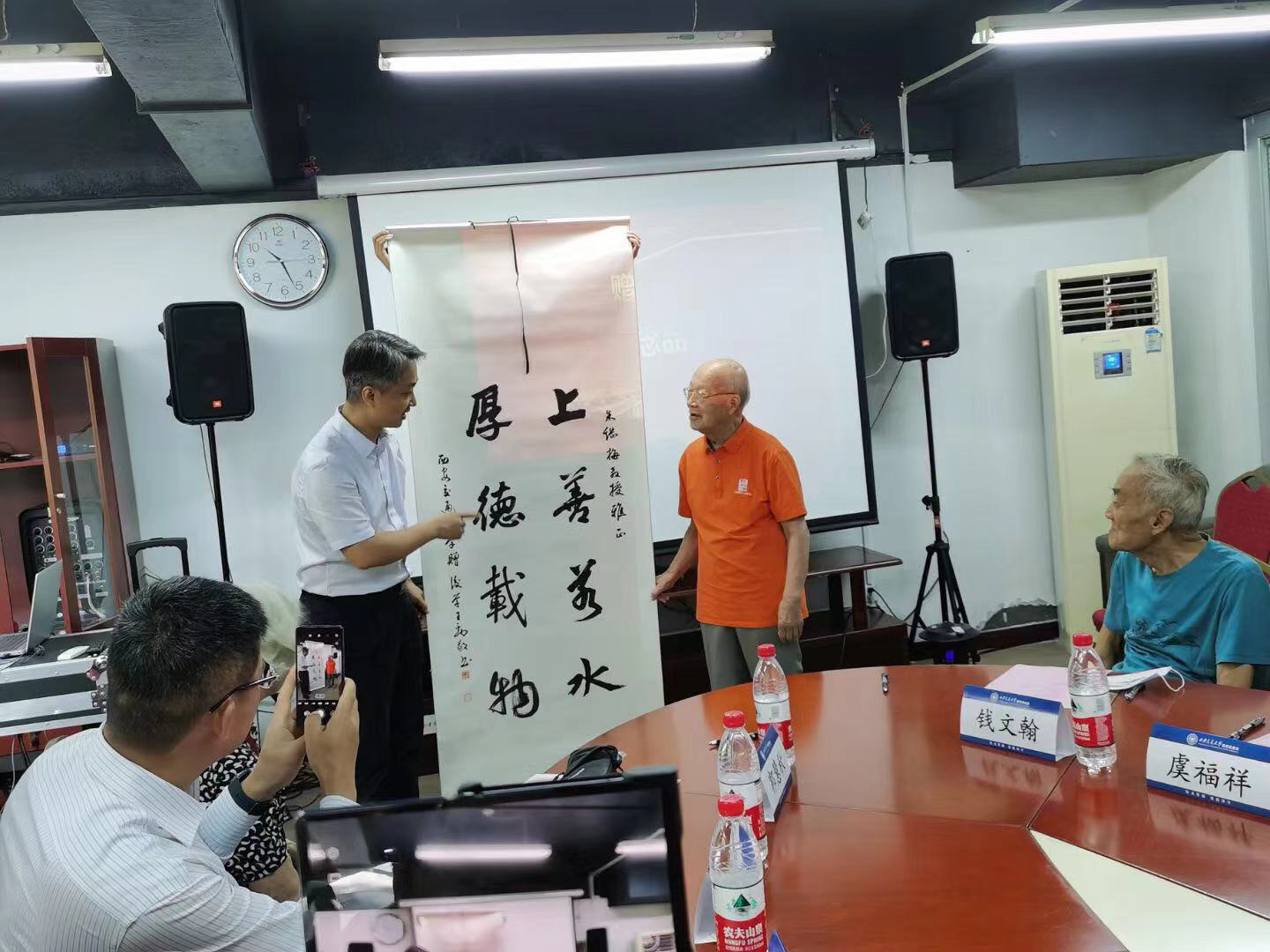 学校教育基金会赵卫滨秘书长与朱继梅教授签订了捐赠协议并向朱老师颁发了捐赠纪念铭牌。李小跃书记代表学校向朱教授敬赠了书法作品。