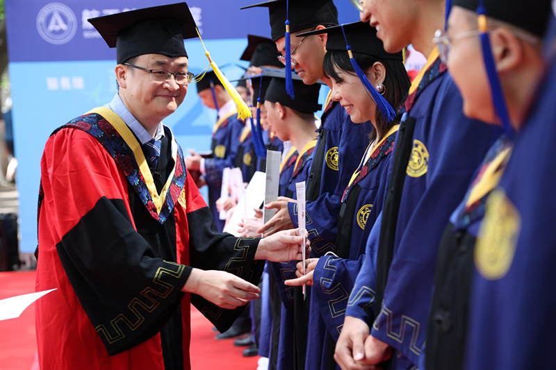 王铁军副校长、申胜平院长、李跃明教授为毕业生们颁授了毕业证书,并亲手为毕业生拨穗。