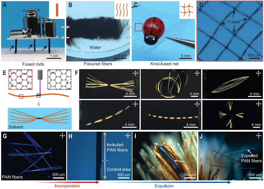可逆融合与分裂的性质有几个潜在的应用展示。首先,制备直径任意可调的粗融合纤维,并且随着融合纤维的直径增加,力学性能基本不下降。可作为结构材料,有望在工程领域发挥力学优势。其次,可以在不同的纤维基组装结构间灵活转换。例如,通过可控的融合与分裂,一万多根GO纤维基组装体在GO柱与节点融合的GO网之间转变,也能在融合的GO纤维与复杂的组装结构之间变化(图3A-F)。再者,GO纤维束通过融合与分裂能实现包含与排除各种客体等功能性,如聚丙烯腈短纤(图3G-J)、亚毫米级的玻璃珠和聚苯乙烯微球等。另外,普通的纤维(包括聚乙烯醇纤维、尼龙、蚕丝、不锈钢丝、玻璃纤维、玄武岩纤维等)通过GO涂层也能具备这种可逆融合-分裂的特性,进一步扩展了相关应用领域的范围。