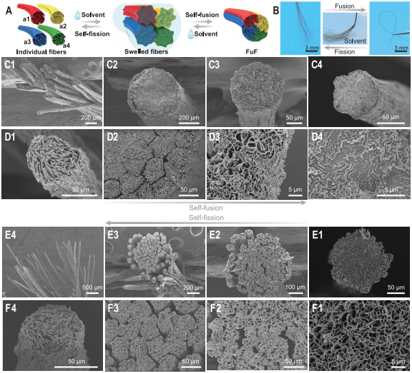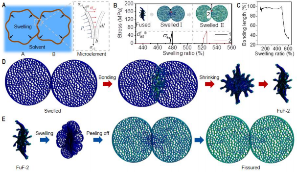 有限元模拟研究和理论分析研究了两根纤维的融合和分裂过程,如图2所示。对于纤维融合过程,揭示了多孔核-壳系统失水收缩导致的壳层失稳过程以及毛细力诱导的纤维褶皱缝合机理;而对于纤维分裂过程,揭示了溶胀纤维几何形状会产生的界面分离驱动力,如图2A所示。