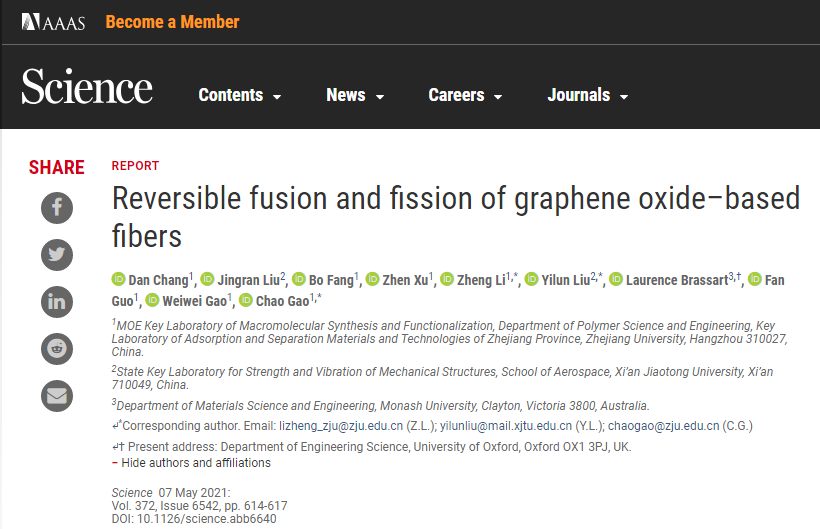 刘益伦教授团队联合浙江大学高分子系高超教授团队联合提出了一种溶剂触发的形貌调控策略,以氧化石墨烯(Graphene oxide , GO)纤维为模型,实现了可逆的融合与分裂。相关成果以“Reversible fusion and fission of graphene oxide–based fibers”为题,于2021年5月7日发表在《Science》上。