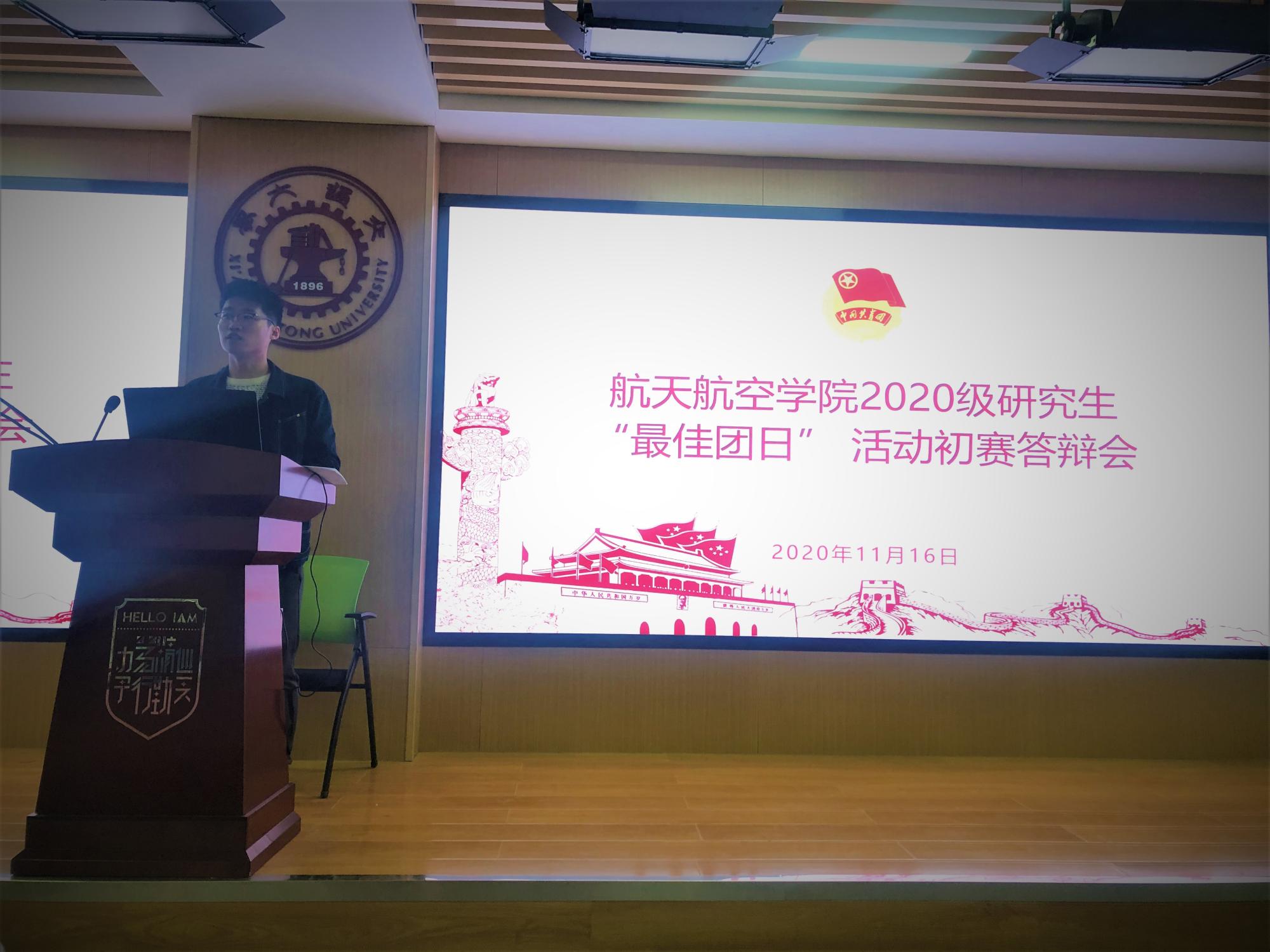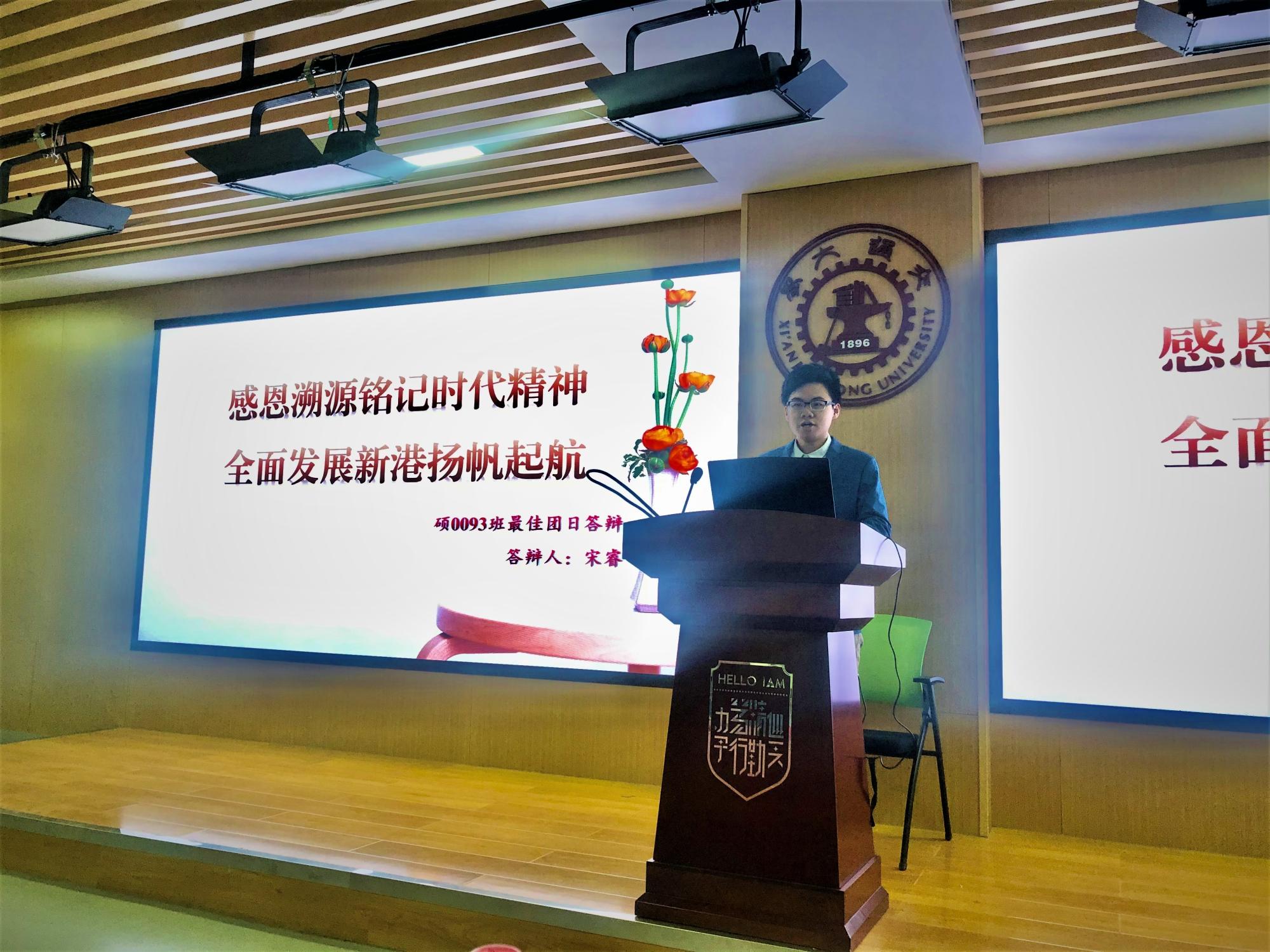 首先是硕0093班宋睿代表其团支部进行答辩。他以“感恩溯源铭记时代精神,全面发展新港扬帆起航”活动主题展开,首先介绍了班级基本情况、班徽和班服的设计。接着通过视频展示、现场演讲,回溯了交大力学的根源和发展脉络,通过展示创新港建设者的采访视频,展现了最朴实无华的新港建设者的身影。最后,宋睿展示了同学们进行“人走关灯打卡”、科学家纪录片观影、体育锻炼等团日活动,这些活动凝聚着同学们的感情,体现了大家对于班集体的热爱。