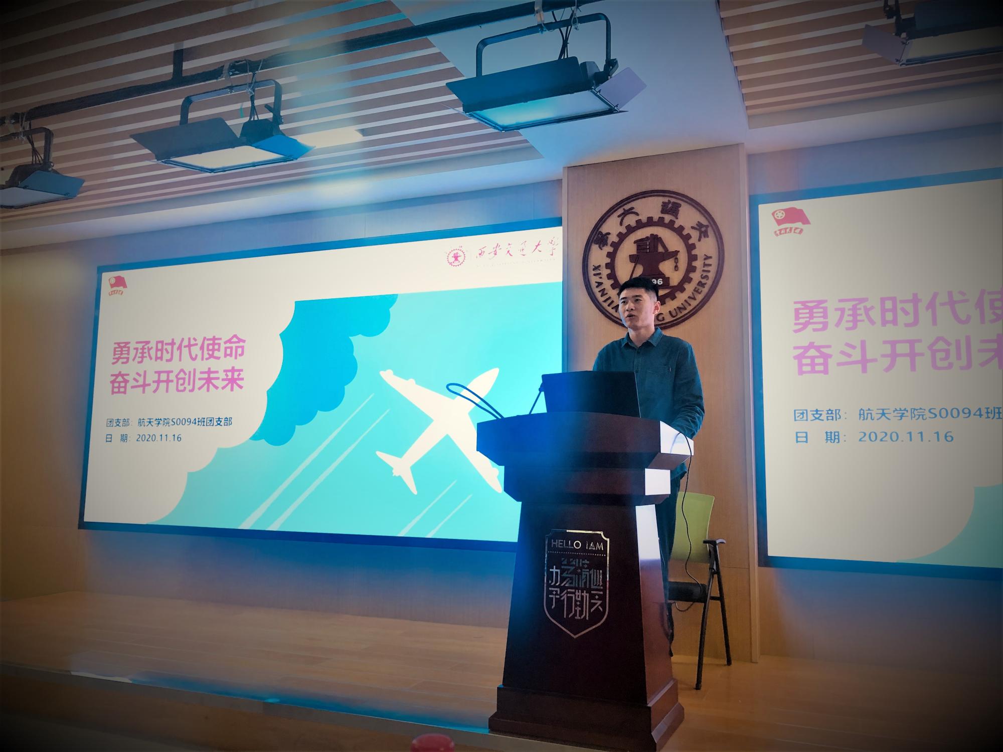 硕0095班团支部张少杰以“共筑星辰大海,放飞西迁之梦”主题展开团日活动。介绍了班服、班徽的设计以及参观西迁博物馆等活动。
