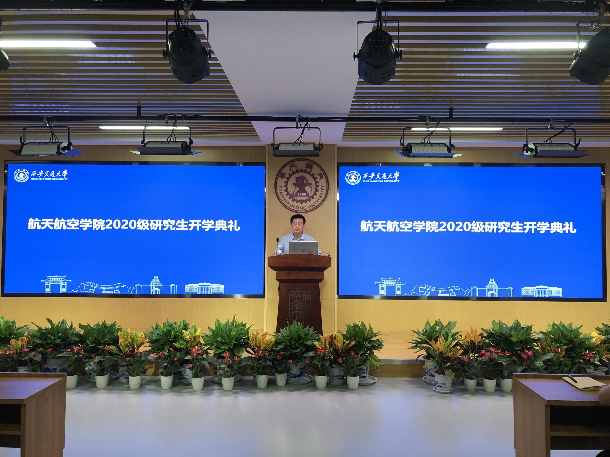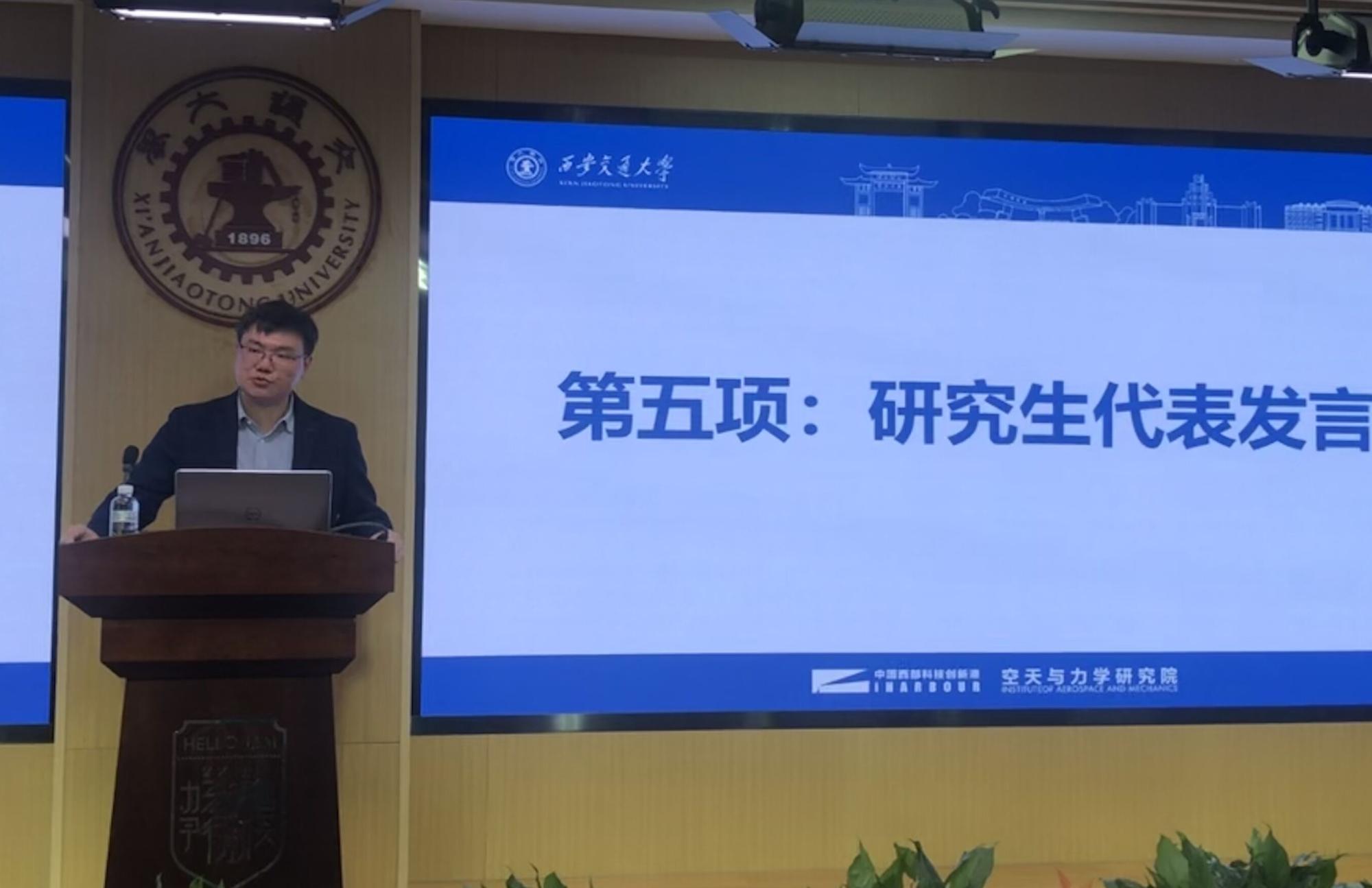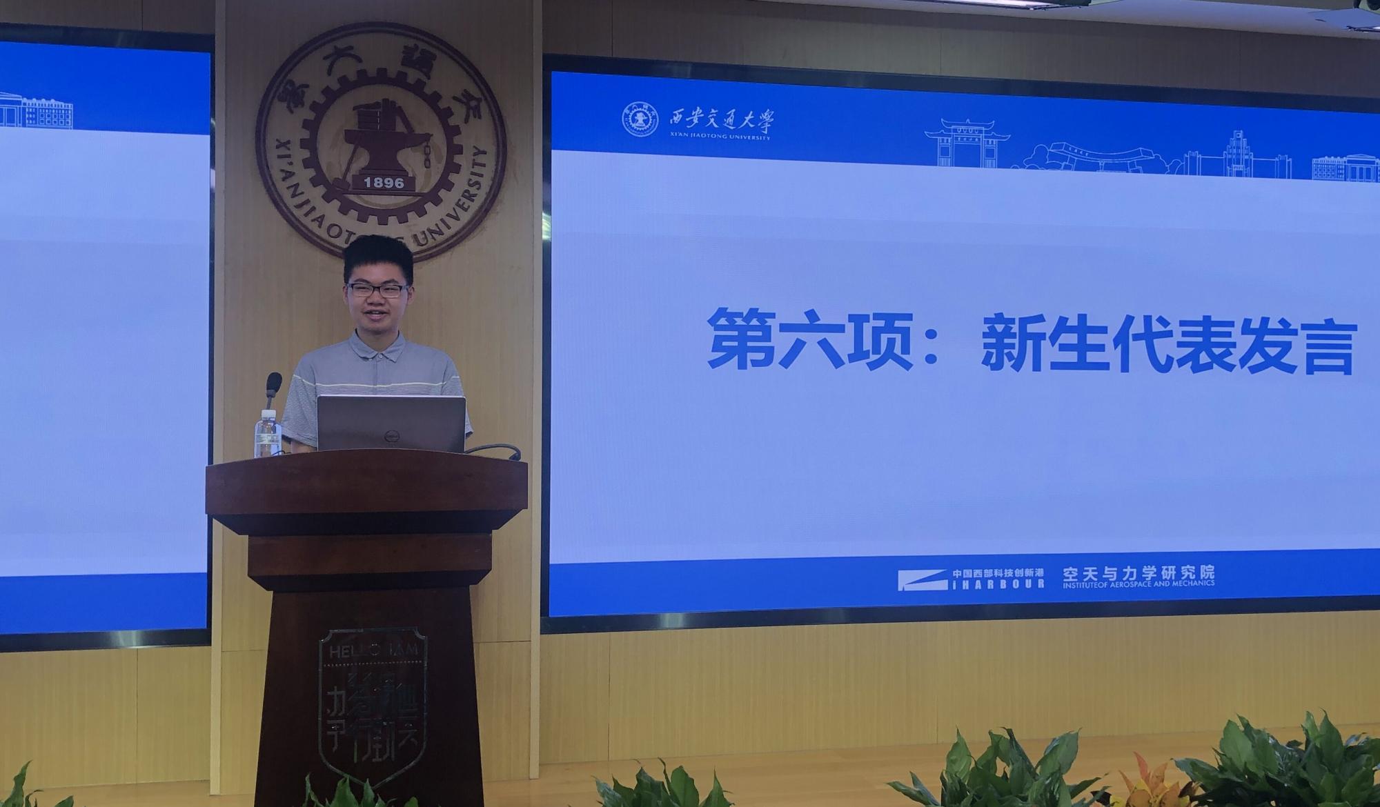 陕西省学联联席主席、博1843班贾鹏锴代表老生发言,他列举身边的人物事例激励2020级新生,把握机遇、珍惜时光、奋勇拼搏,传承西迁精神、增长本领才干、锤炼品德修为。