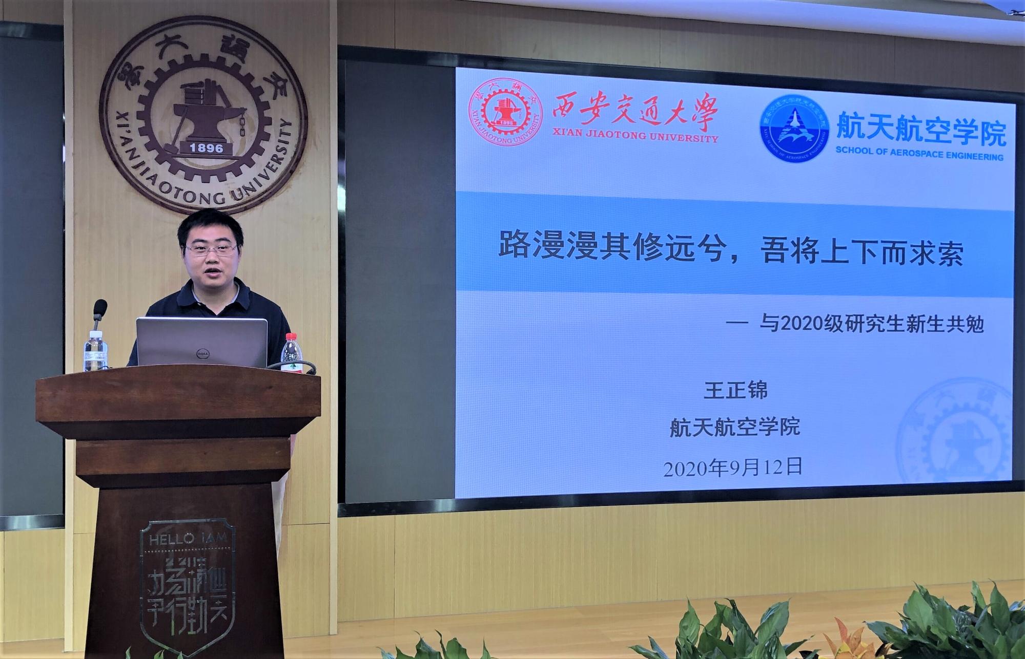 王正锦教授代表青年教师向同学们分享了自己的求学经历。王教授从“学什么”入手,以“器、术、道”引导研究生熟练掌握科研工具、培养解决问题的能力,形成独立科研的能力。在“怎么学”中给新生们提了“有态度、有目标、有计划、有行动” 四点要求。希望同学们利用丰厚的资源,抓住机会,做有准备的有为青年。