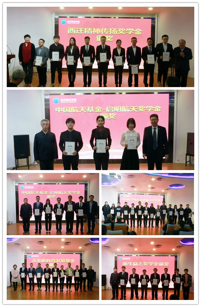 学生表彰奖励及奖学金评选的整体情况。接着参会领导和嘉宾为“西迁精神传扬奖”、中国航天基金—启明航天奖学金、沈亚鹏教育发展基金、新生励志奖学金、国家励志奖学金、国家奖学金的获得者颁奖并合影留念。