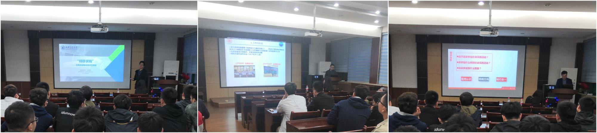 随后三位同学分别作了进行了分享。宋思扬同学通过介绍参加互联网+活动的经历分享了自己参与科技竞赛活动的心路历程以及收获和体会,勉励大家要敢闯会创,勇立时代潮头。贾鹏锴同学分别从提高认识、明确方向、行知合一三个方面分享了自己投身社会实践的切实体会,提醒同学们要正确认识自我、正确认识实践活动的有益作用,鼓励大家积极探索,通过社会实践认识自己,认识社会,平衡和丰富科研生活。闫贝通过介绍自己的科研内容,科研成果及获奖,以及丰富的研究生校园文化生活提醒大家要张弛有度,学会放松和调节,最后就如何把握科研方向,对待科研的态度等方面分享了自己的感悟。