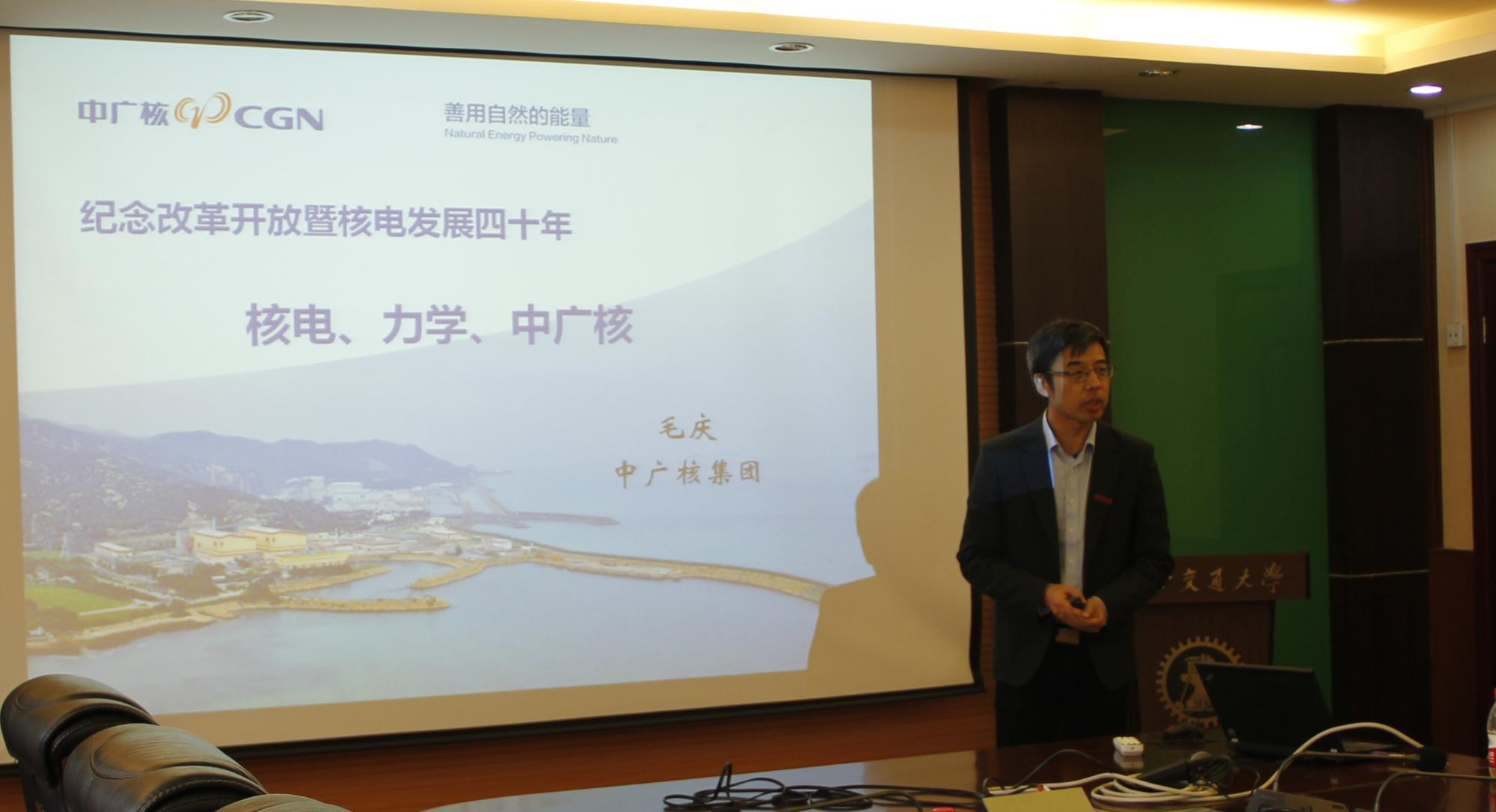师生带来了主题为“纪念改革开放暨核电发展四十年:核电、力学、中广核”的精彩报告,他介绍了中国核电发展四十年的历程,改革开放的四十年,也是中国核电与中广核快速发展的四十年,通过四十年的重要时间节点阐释了核电发展重要突破和成就以及未来核电的发展计划;强调了力学在核电工程中的重要性,着重介绍了力学在核电厂的设计、建造、安装、调试、运行及延寿退役整个全过程中的广泛应用。毛庆研究员也展示了中广核部分校友对学弟学妹的寄语,希望更多的交大学子加盟中广核,也希望加强教师与中广核的项目合作,推动中国核电的更快发展,也希望母校的明天更美好。