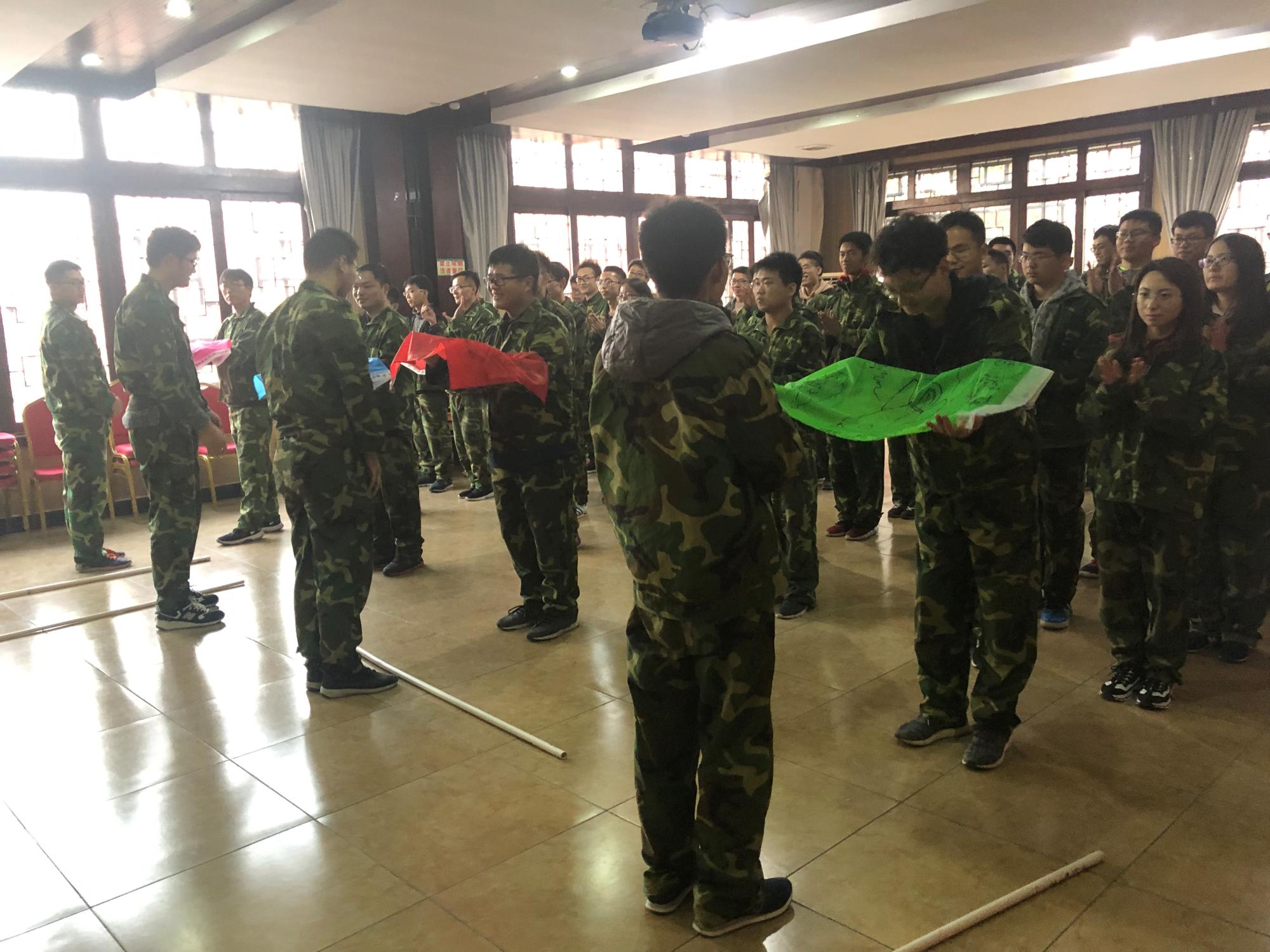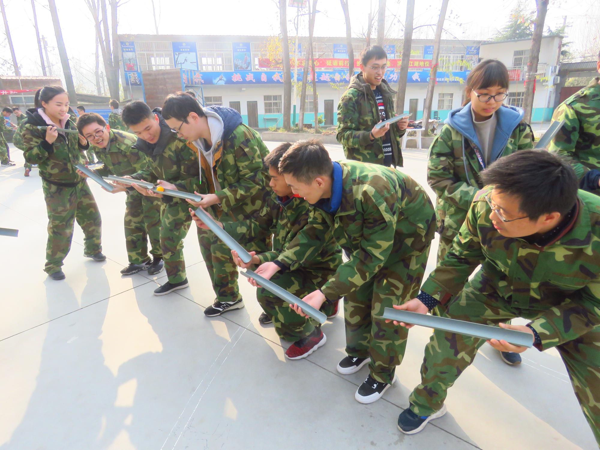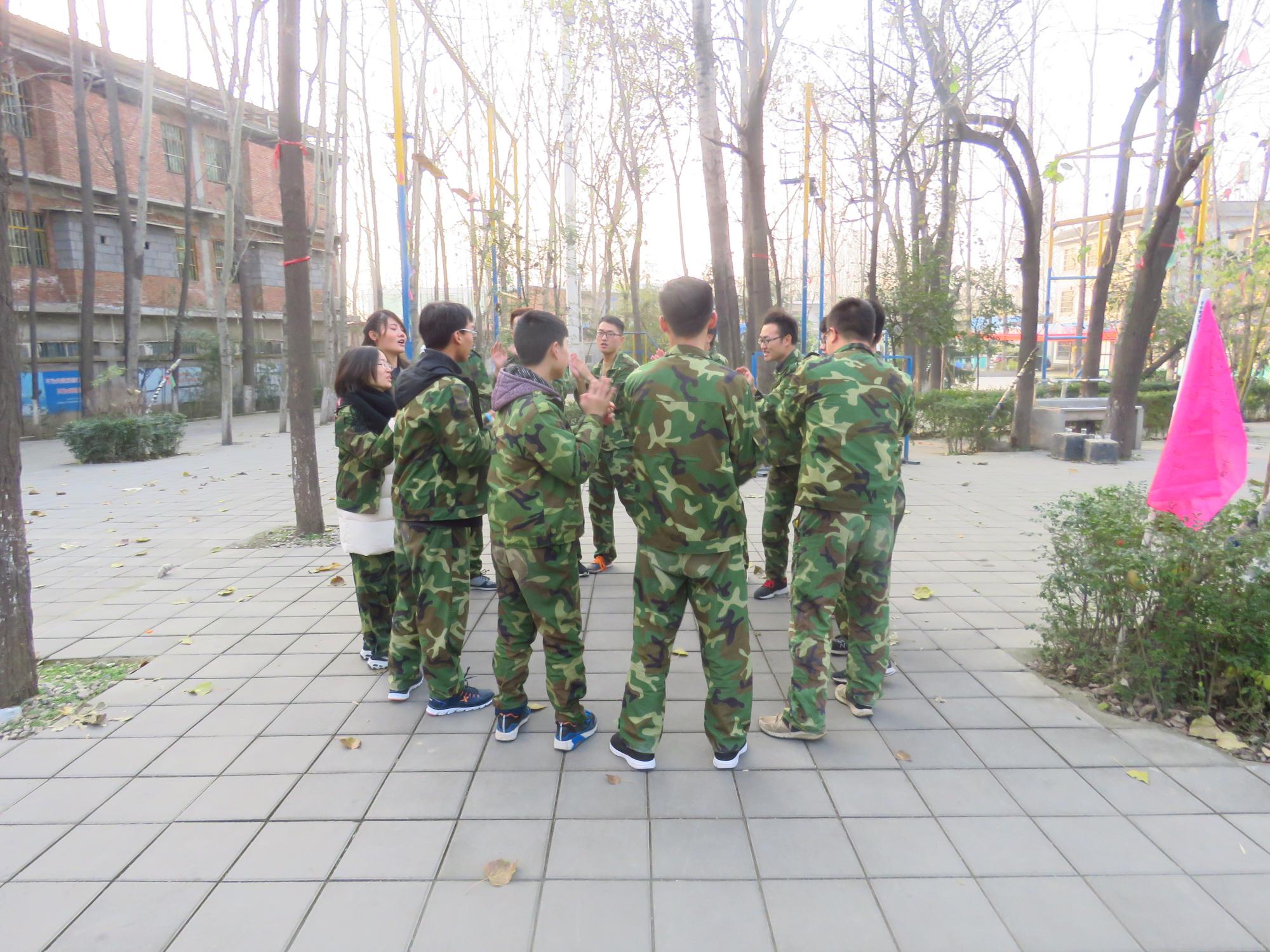 早上8点,同学们乘坐大巴来到基地,换上迷彩服开始一天的训练。在团队建设活动中,将同学们分成“火箭一队”、“飞拳队”“飞天队”“火箭四队”四支队伍,各支队伍通过起队名、队歌和口号的方式完成了团队组建。