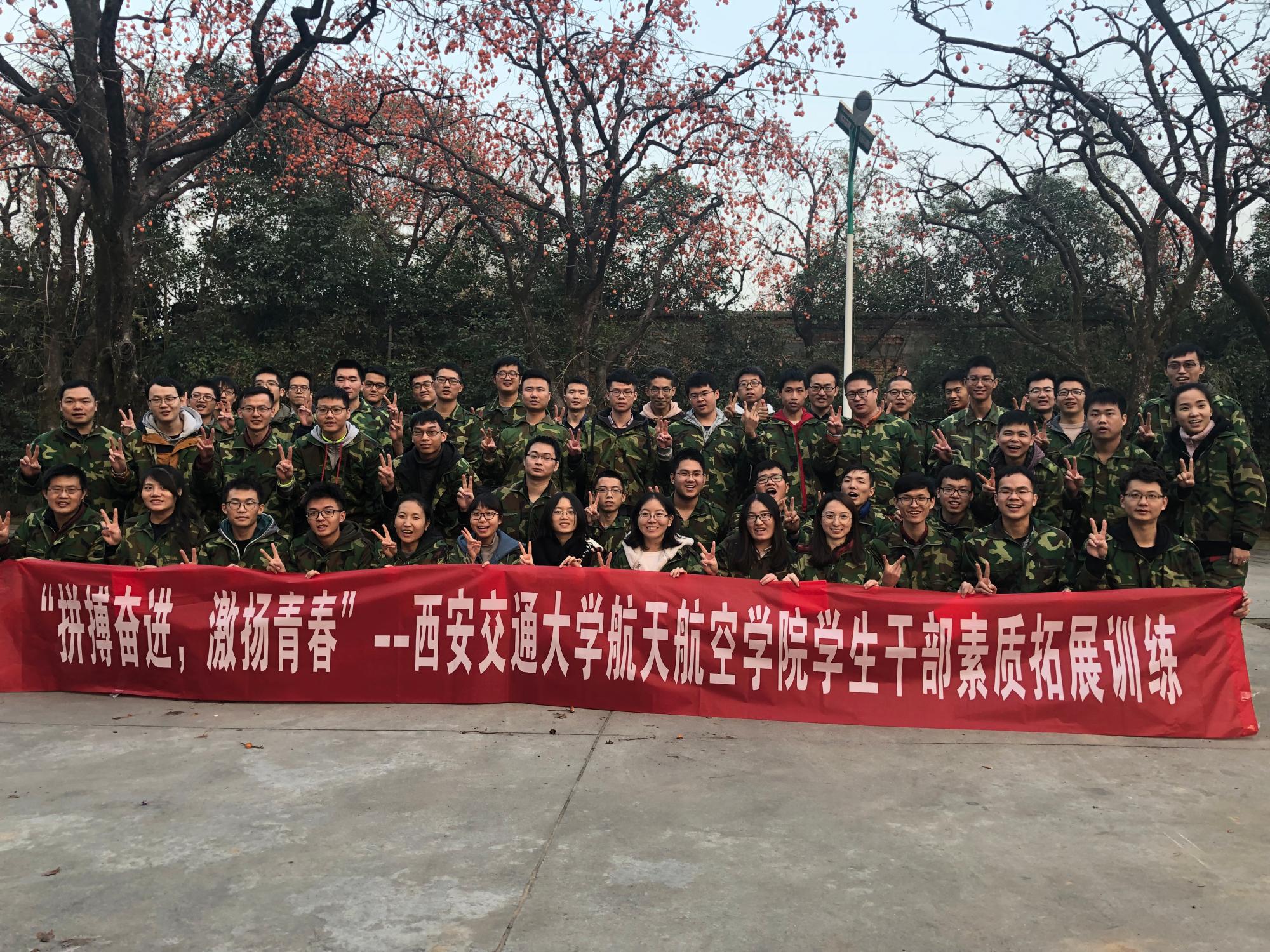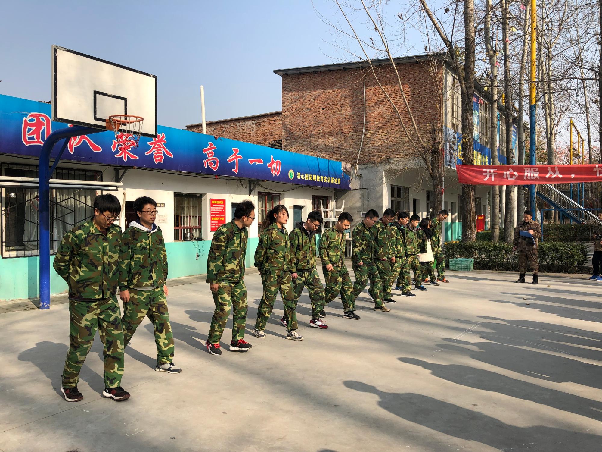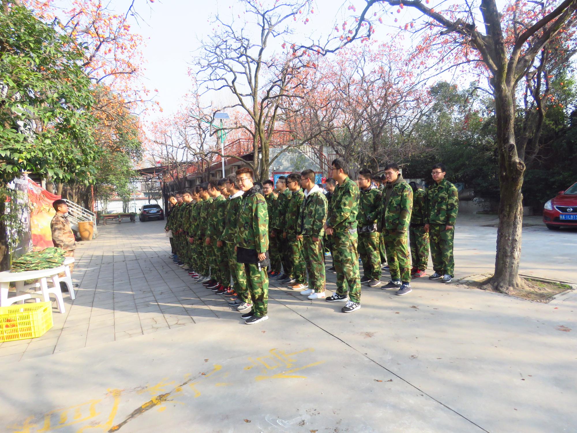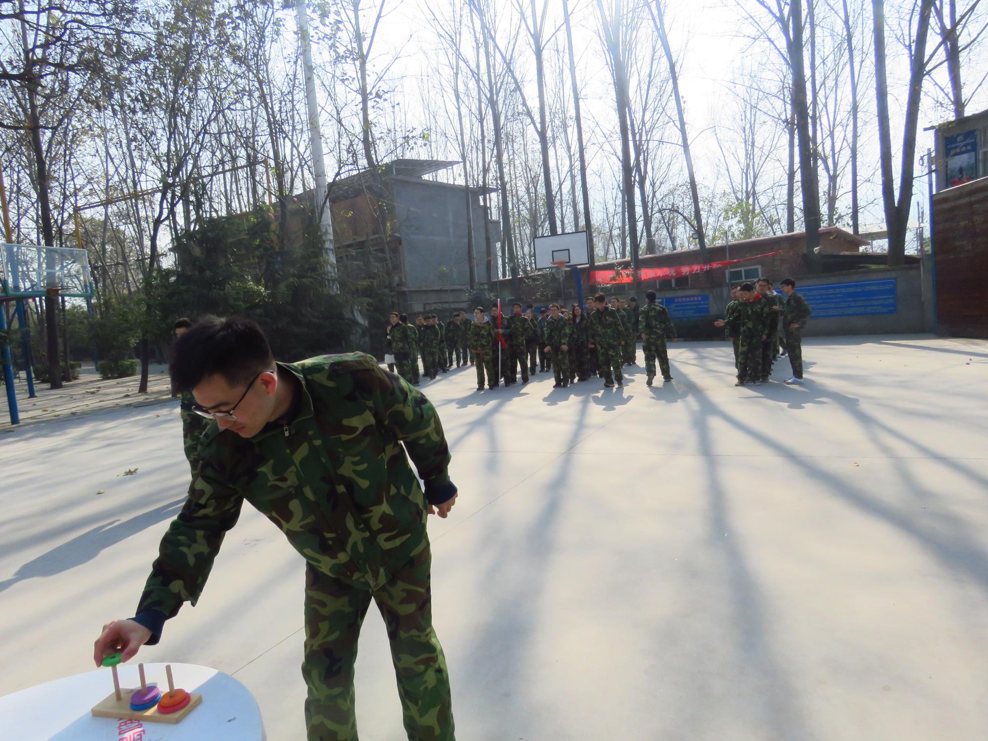 早上8点,同学们乘坐大巴来到基地,换上迷彩服开始一天的训练。在团队建设活动中,将同学们分成“火箭一队”、“飞拳队”“飞天队”“火箭四队”四支队伍,各支队伍通过起队名、队歌和口号的方式完成了团队组建。