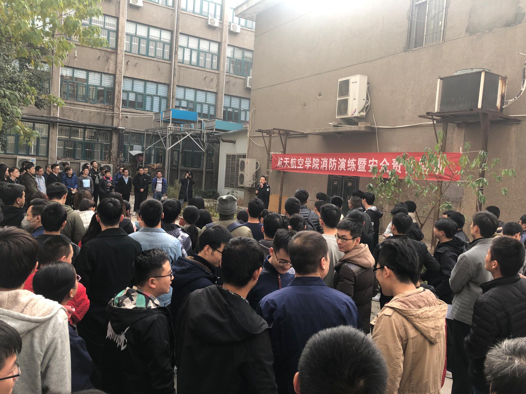 本次疏散演练利用发烟筒模拟火灾逼真效果,进行教一楼发生火灾后的逃生演习,在火警哨声的警报下,全体师生手持湿毛巾握住口鼻、弯腰、贴墙从工作室、实验室、办公室快速有序进行疏散。在组织人员认真细致地制定的演练活动方案组织下,完成了在楼下空旷地带快速集合的任务,消防疏散演练取得了预期效果。