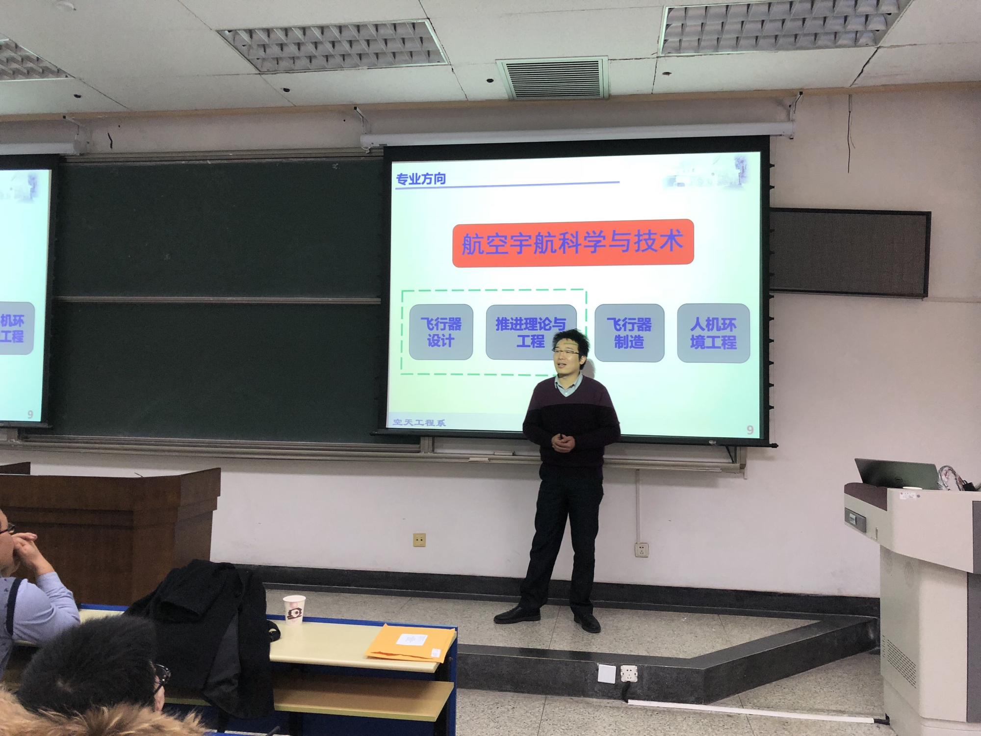 随后,航空宇航科学与技术系副主任刘振副教授从 专业、基地、队伍、人才四个方面出发,向同学们介绍了航空宇航科学与技术专业的具体情况。刘振老师指出,通过专业基础类课程和专业核心类课程的学科学习及能力训练,最终目的是培养学生成为杰出的推进设计师。在课程之外,多层次的校内外实践基地,国际化、多元化的师资队伍以及丰富的竞赛和实践活动等,都将助力学生成为一流人才。在优良的软硬件条件下,刘振老师希望学生们“加入航空航天大事业”,追逐蔚蓝的天空,探索星空的奥秘。