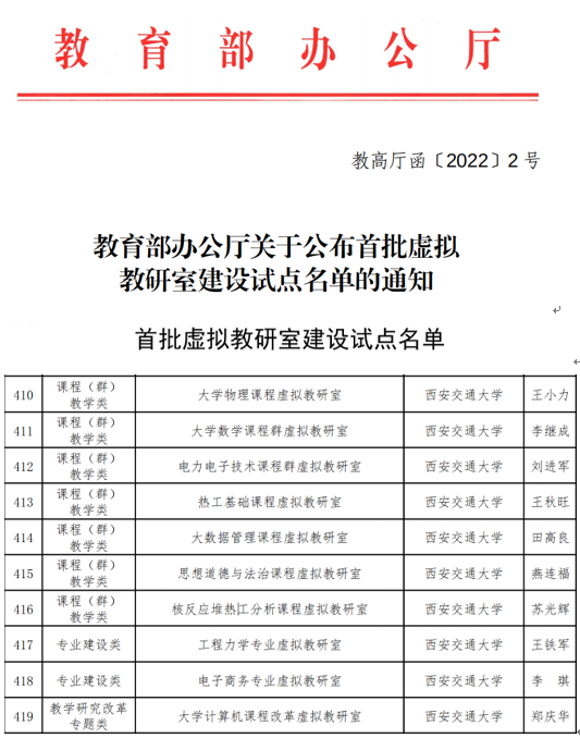 近日,教育部办公厅公布首批虚拟教研室建设试点名单,由我院牵头,联合兰州大学、西北工业大学、清华大学工程力学专业共建的工程力学专业虚拟教研室获批立项。