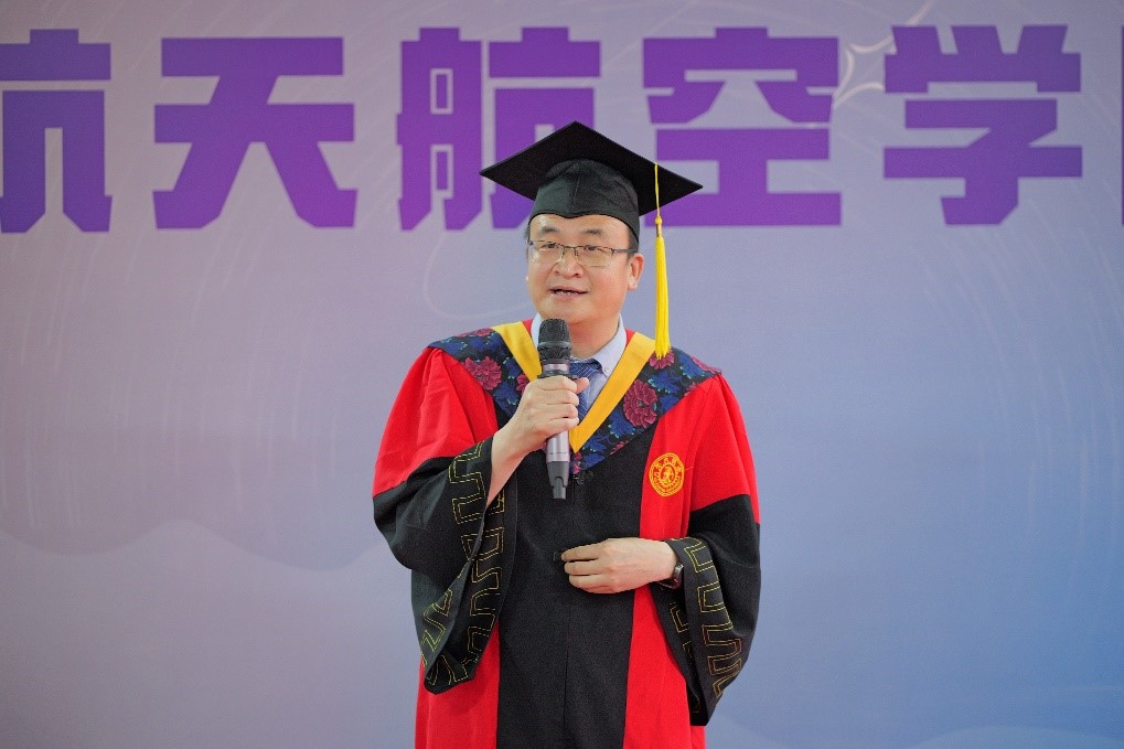 申胜平院长为毕业生送上寄语,他首先代表学院全体师生员工祝贺2023届毕业生顺利完成学业,鼓励同学们要心怀星辰大海,追求卓越,做世界舞台的竞演者,要积极进取、敢于拼搏,努力走向世界舞台的中央;要心怀星辰大海,力学笃行,做世界难题的攻关者,不畏艰险,努力攻克“卡脖子”难题;要心怀星辰大海,精勤巡天,做世界强国的建设者,将个人理想同服务祖国、人民的需求结合起来,成为社会主义强国建设者。最后,他亲切嘱托同学们,要坚持开拓视野,努力前行,做一个全世界的“水手”,奔赴所有的码头。不管走的多远,不要忘记航院是所有人的家园。